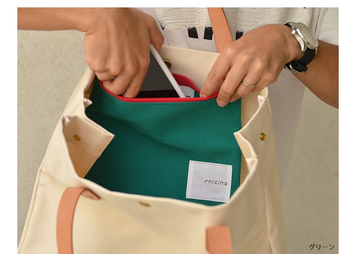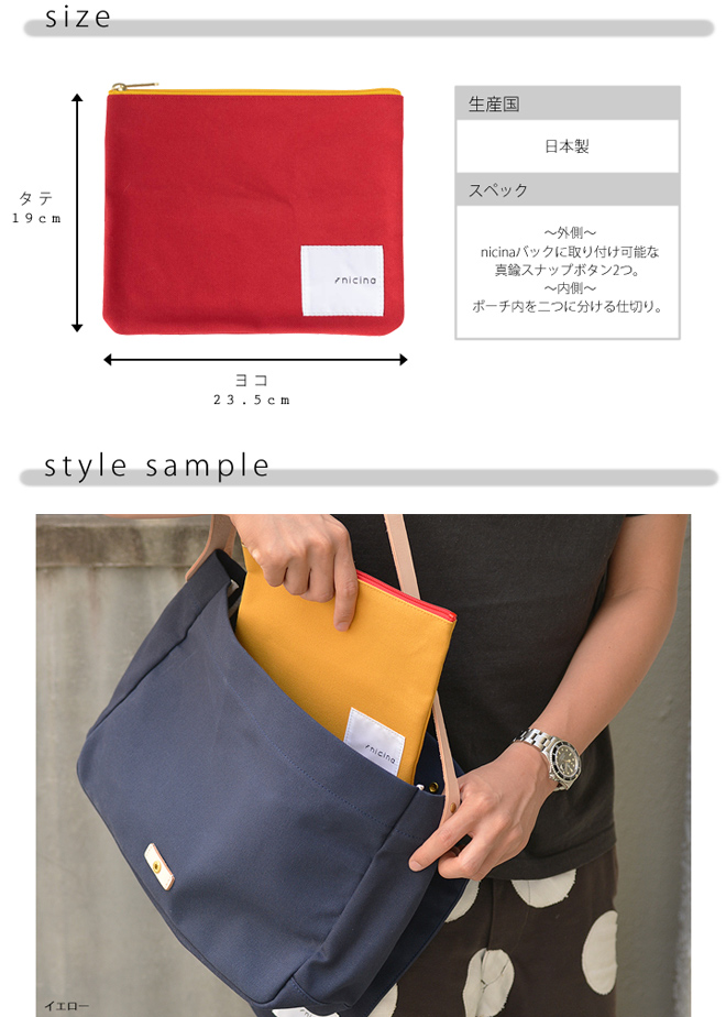 nicinaバックシリーズにインナーポケットとして取り付けができるため、お好きな色合いでコーディネートが楽しめます。 またポーチの裏側にはnicinaオリジナルバックシリーズに取り付けができる、真鍮製スナップボタンがついています。