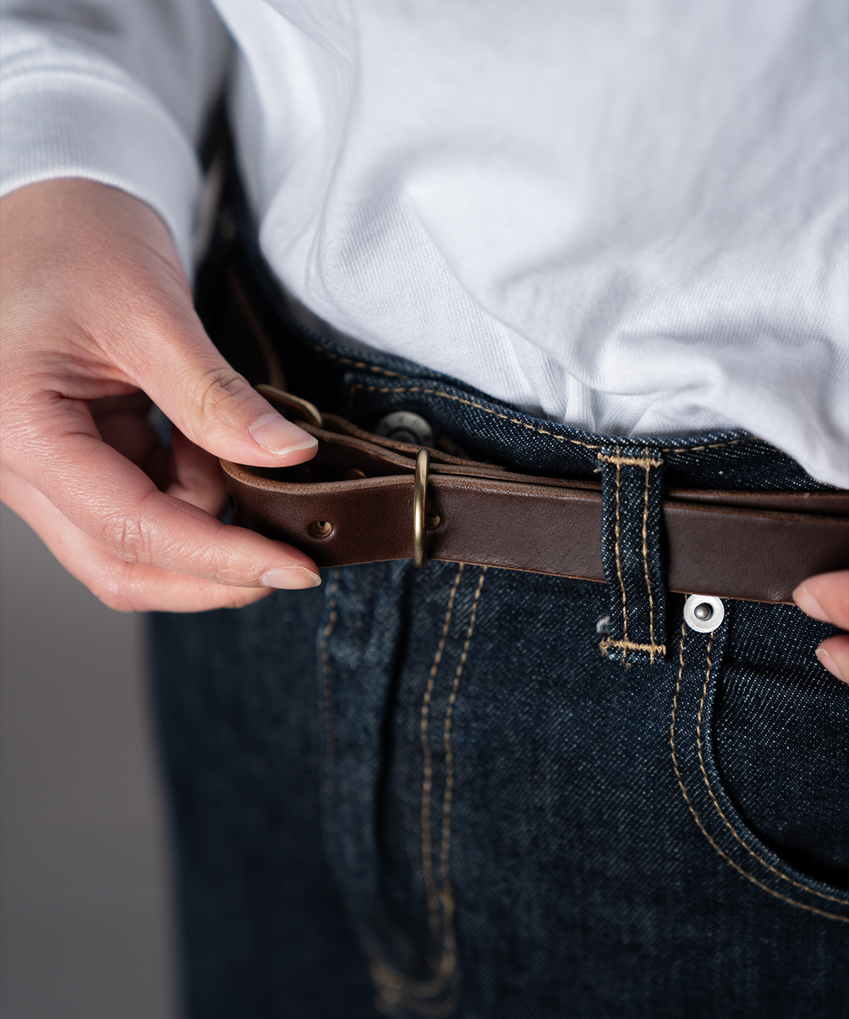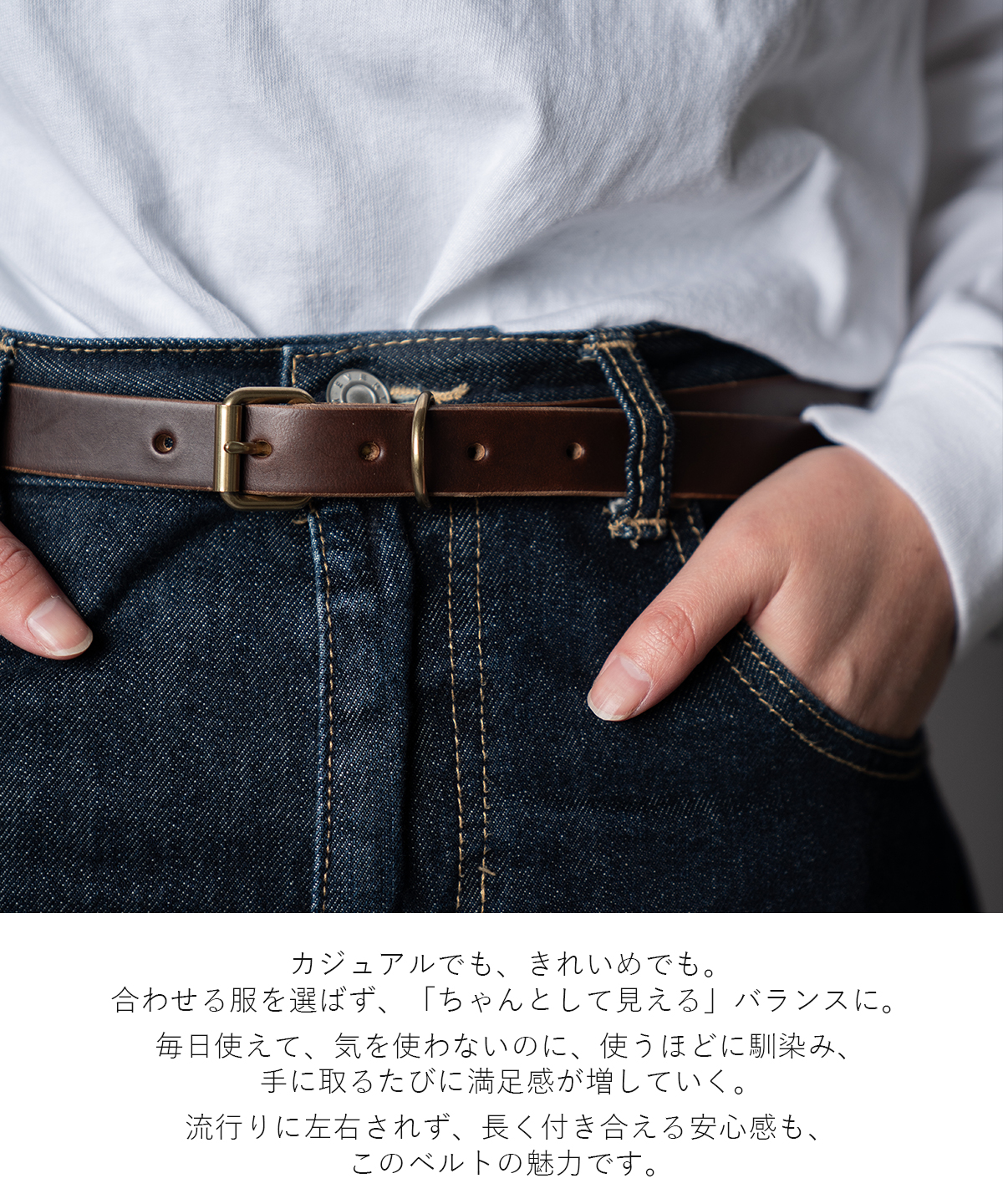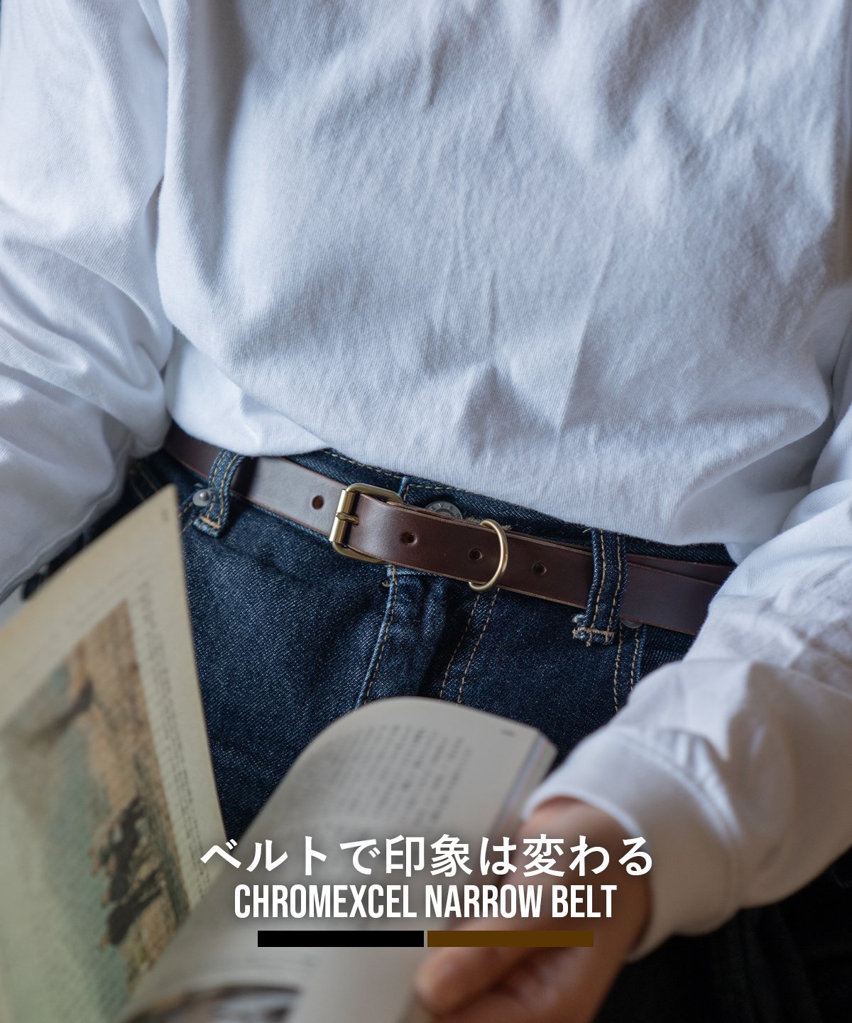 RE.ACTのクロムエクセル ナローベルトは、主張しすぎない細身のバランスで、装い全体をすっと整えてくれます。