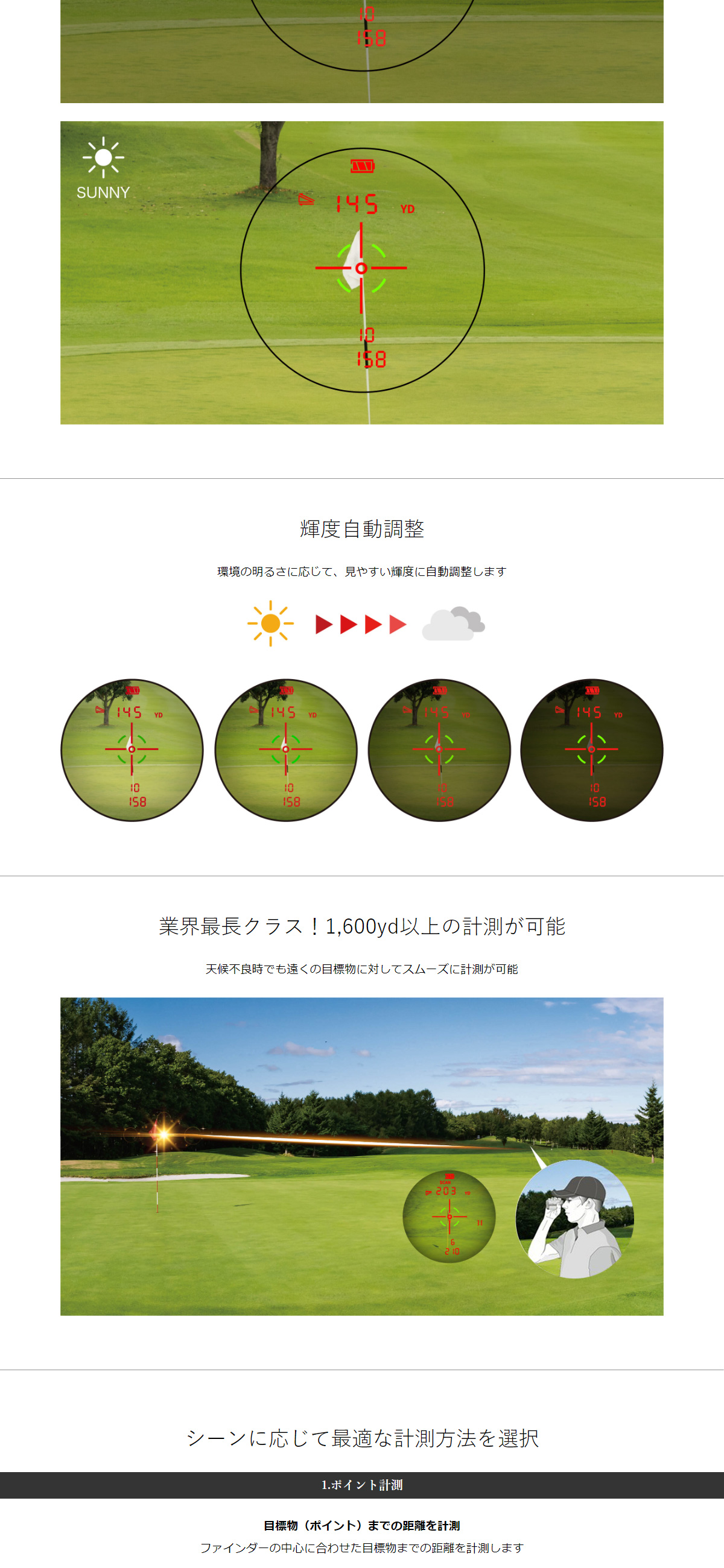 視認性抜群のGreen&Red表示モデル。最長計測距離は脅威の1640y!遠くの目標物にも照準を当てやすいです。わずか0.2秒HI-SPEED計測。充実した3種の計測方法・ポイント計測・ピンシーク計測・スキャン計測。