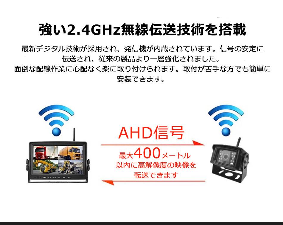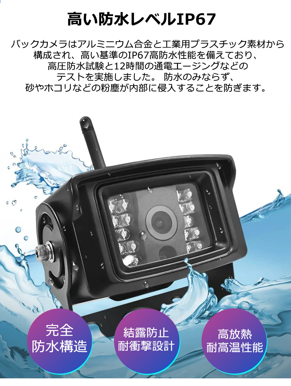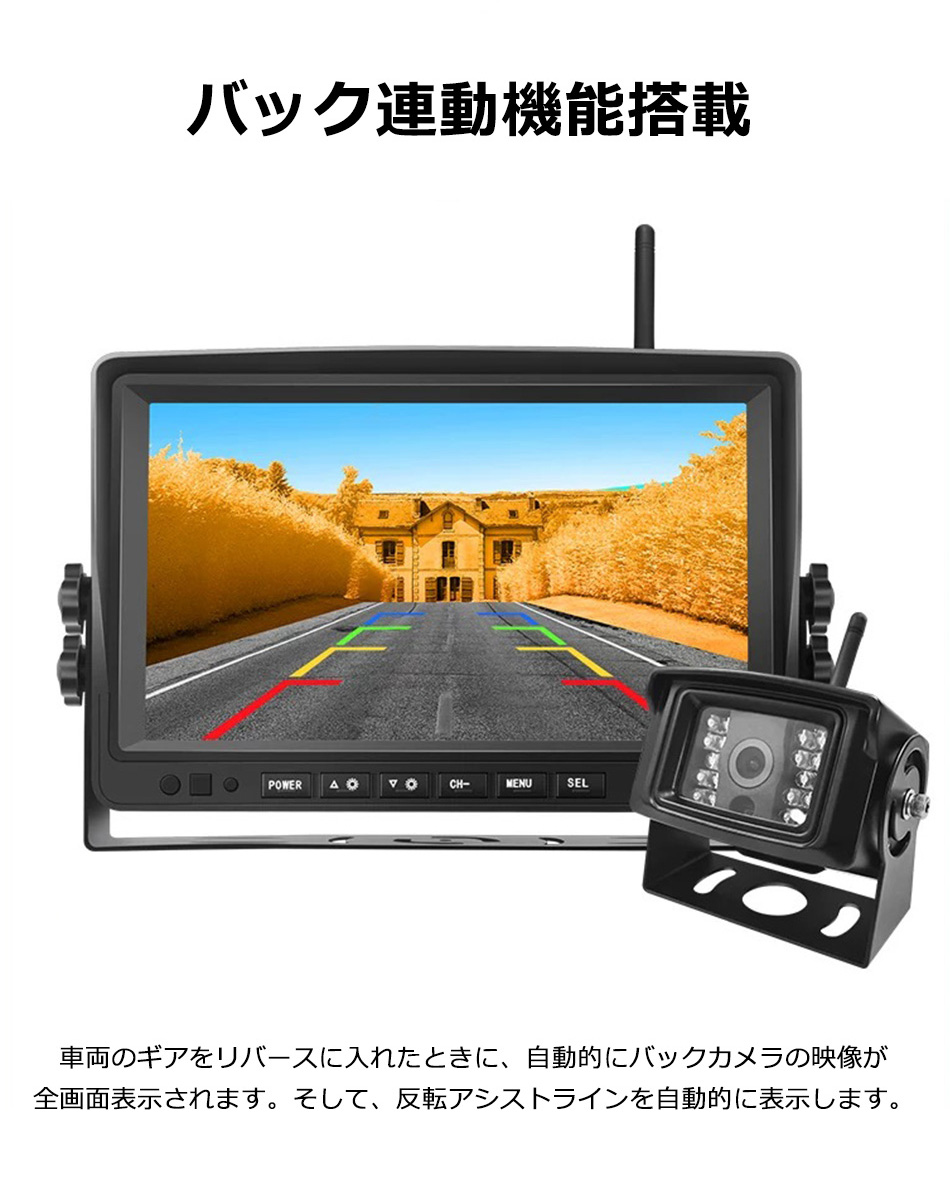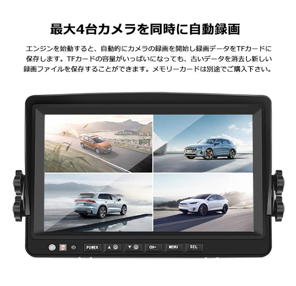 左右前後カメラ バック連動機能付き!カメラとモニターとの距離がある大型トラックなどにも! トラック バックカメラ ドライブレコーダー 日野 三菱ふそう いすず UDトラックス リモコン付き タイムラプス オンダッシュ 【商品説明】 このドライブレコーダーセットは、トラックやバスなどの大型車にぴったりのアイテムです。 10インチの高品質IPS液晶モニターと、ワイヤレスで接続できる4つの高画質AHDカメラが付属しています。 12V/24V兼用で、どんな車両にも対応可能。広角防水カメラは、左右前後をしっかりとカバーし、 安心のドライブをサポートします。録画機能と連動機能も搭載しており、重要な瞬間を逃しません。 リモコン付きで操作も簡単です!
