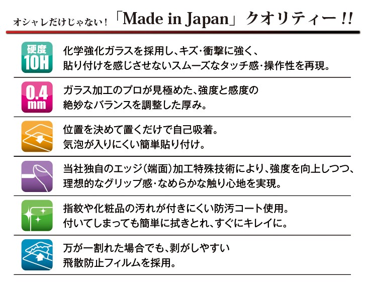 化学強化ガラス採用し、キズ・衝撃に強く、オリジナルと同じようなスムーズなタッチ感・操作性を再現