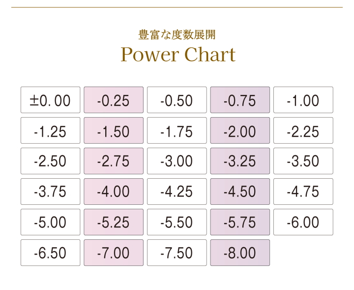 度数:±0.00D、-0.25D〜-6.00D(0.25Dステップ)、-6.50D〜-8.00D(0.50Dステップ)