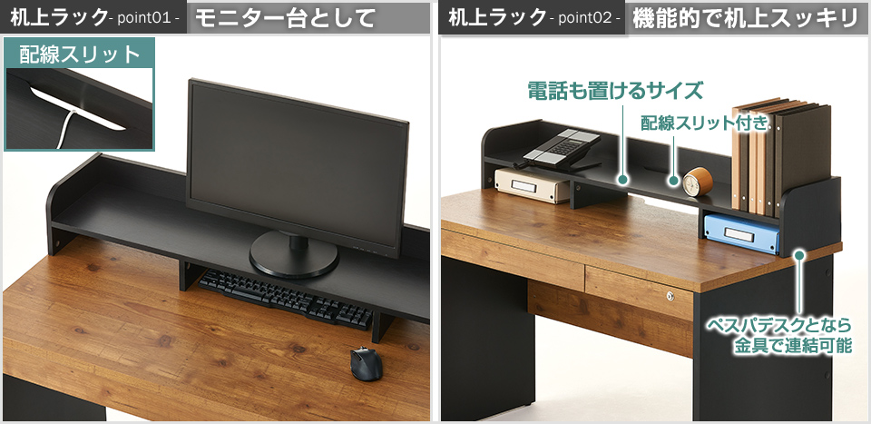ラック上に、モニター、A4ファイル、電話、頻繁に使用する小物などを置いてスッキリ整理。コード類はスリットから配線できます。また、ラック下にはキーボードや資料ケースなどを収納して、スペースを有効活用できます。