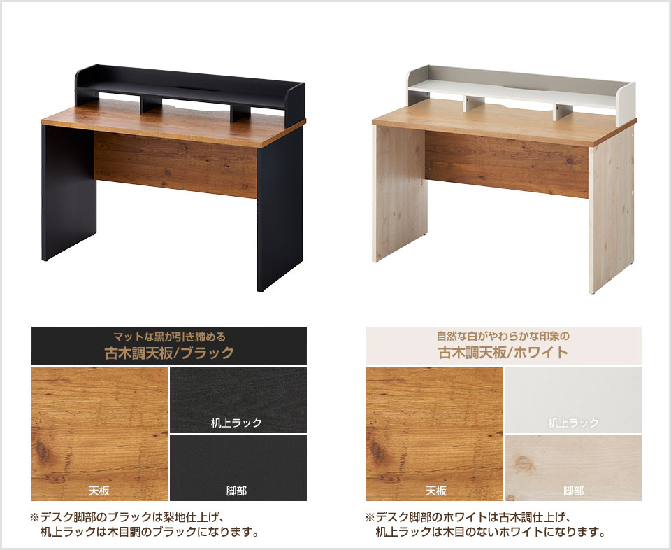 古木調天板がヴィンテージ感を演出する、デスク+机上ラックセット