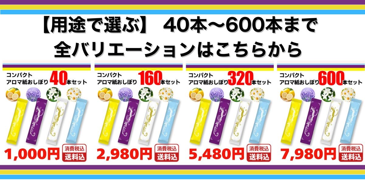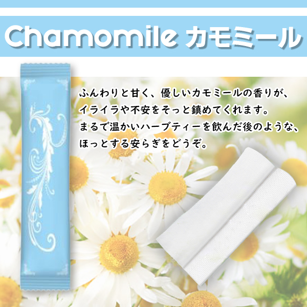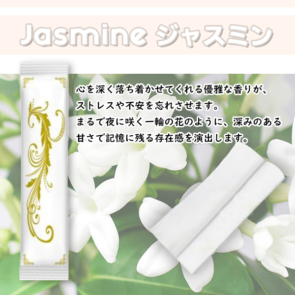 カラーと香りは白(ジャスミン)、黄(レモン)、水色(カモミール)、紫(ラベンダー)の4種類をご用意。