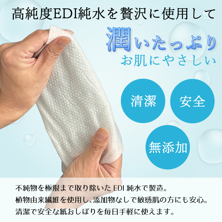 競合商品に比べて水分量が多く、しっとりとした拭き心地を実現。乾燥しやすい季節でも肌にやさしく、拭いた後も手がつっぱらずしっとり感が長続きします。