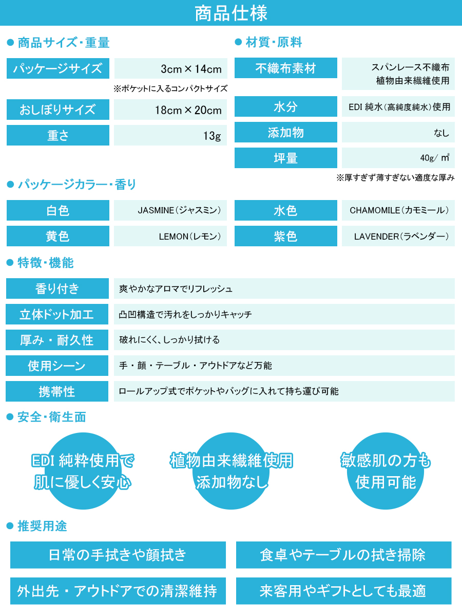 【コンパクト設計】個包装タイプで軽くて携帯しやすく、バッグやポケットにもスッと収まるサイズ感。旅行・食事・お出かけ先など、あらゆるシーンで便利に使えるコンパクトな紙おしぼりです。
