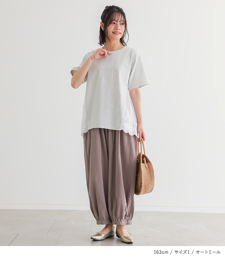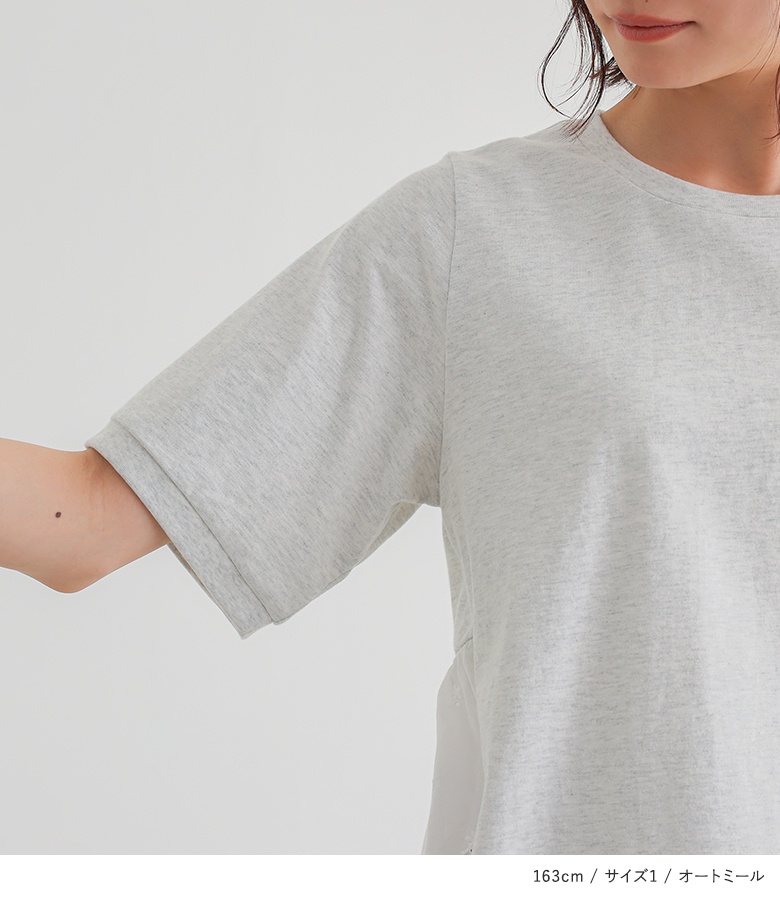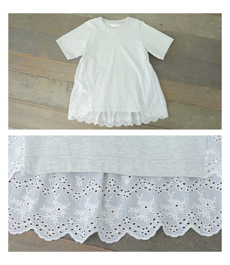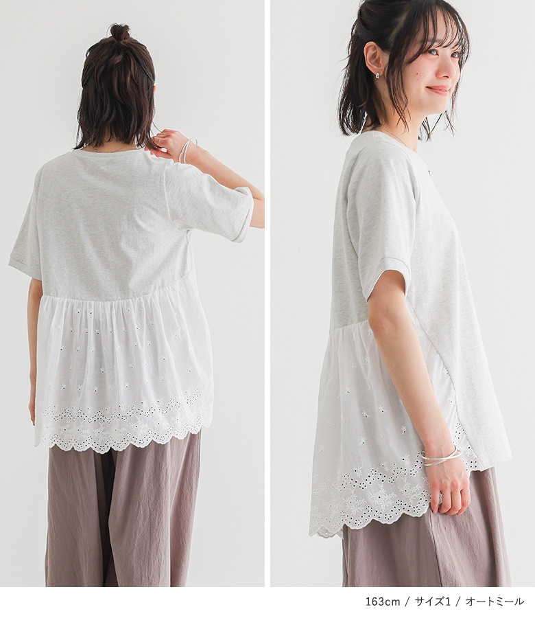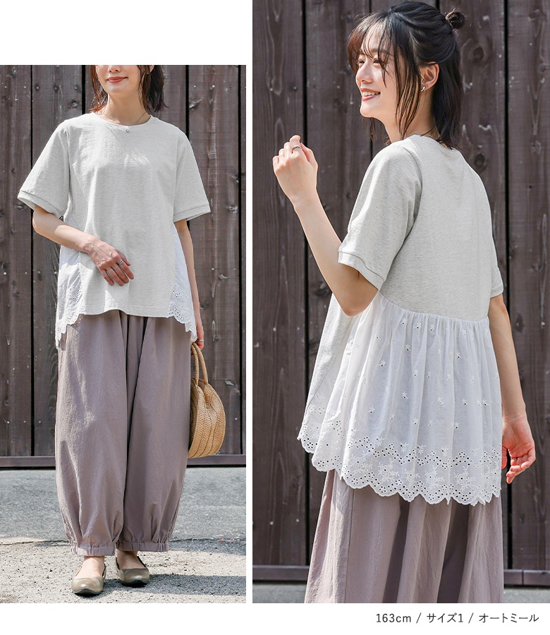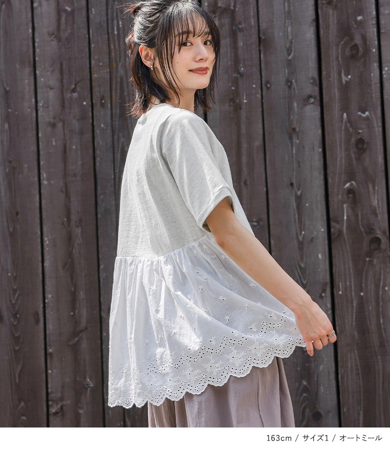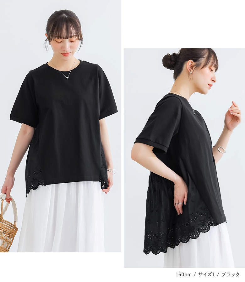 Tシャツ レディース 春 夏 トップス 半袖 カットソー レース クルーネック 綿100% コットン100% お尻が隠れる 二の腕カバー 無地 「メール便可」「10」