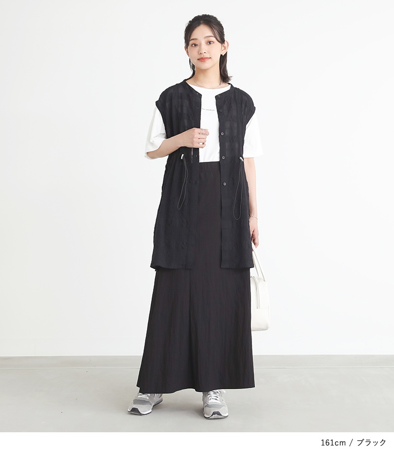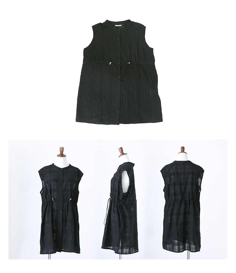 ウエスト部分のドローストリングゴムでシルエットを調節できるジレベスト。ぽこぽことしたシアーチェック柄がアクセントになった一枚。ヒップも隠れるチュニック丈のベストで、体型カバーにもなります。
