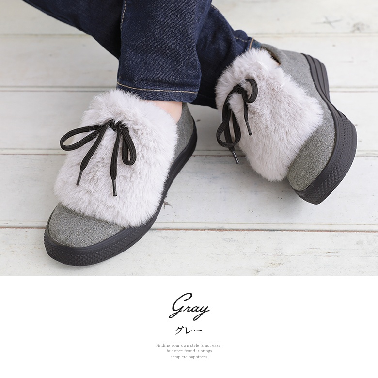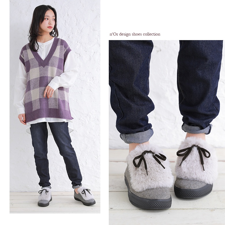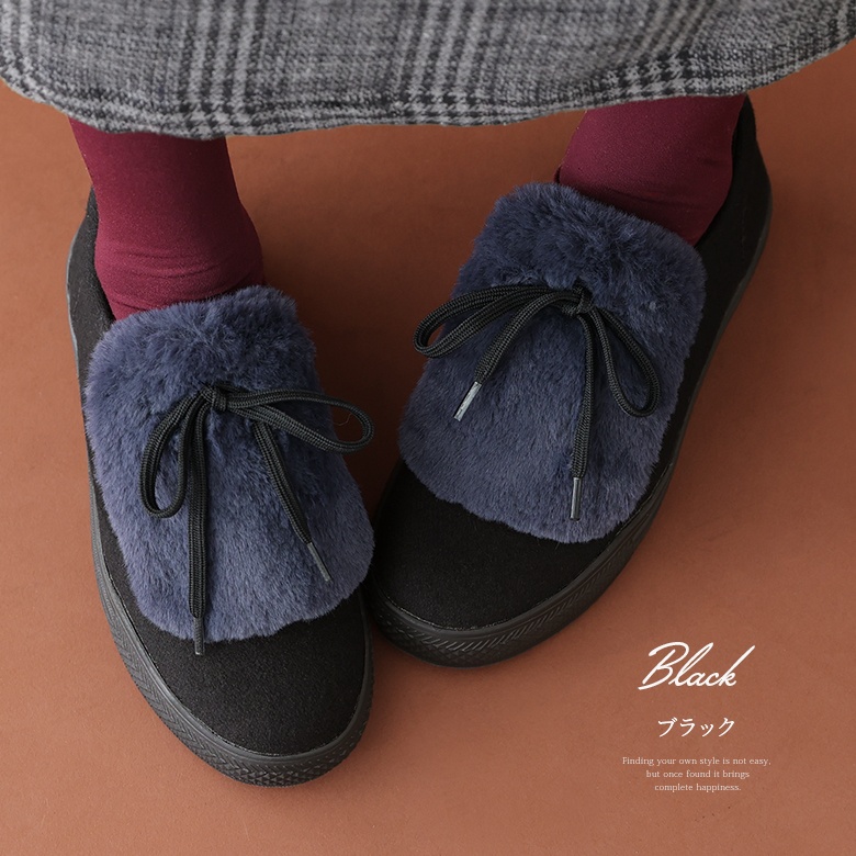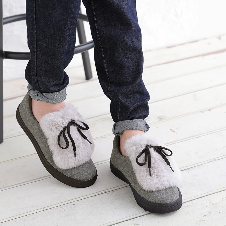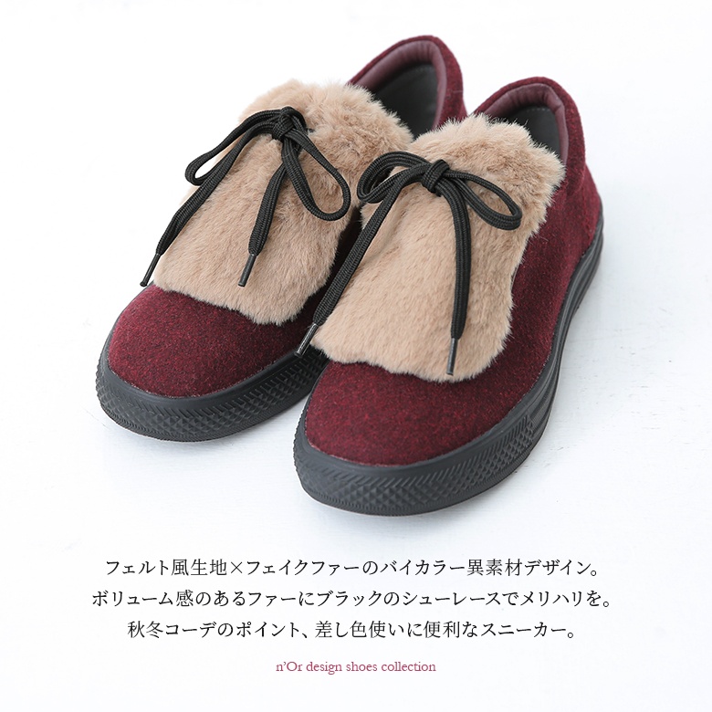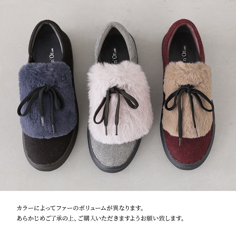 フェルト風生地×フェイクファーのバイカラーが映える異素材デザイン。ボリューム感のあるファーにブラックのシューレースでメリハリをつけて、これからの季節のスタイリングに差し色としてお洒落のポイントになります。