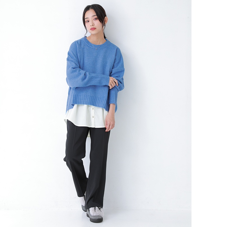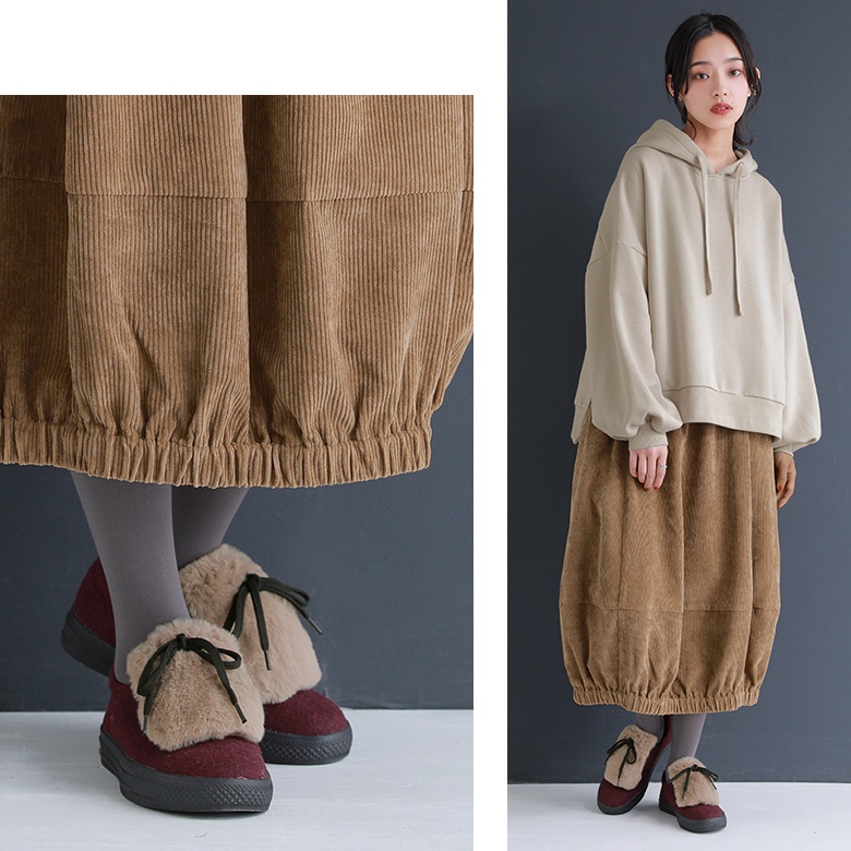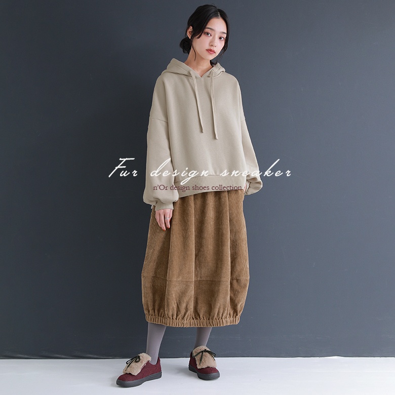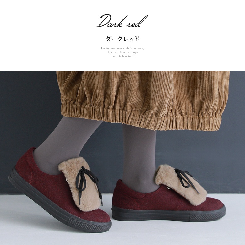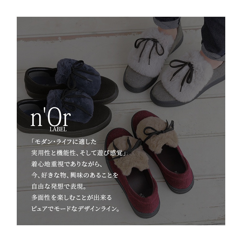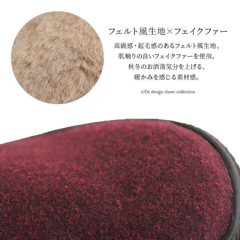 フェルト風生地×フェイクファーのバイカラーが映える異素材デザイン。ボリューム感のあるファーにブラックのシューレースでメリハリをつけて、これからの季節のスタイリングに差し色としてお洒落のポイントになります。