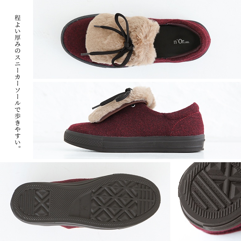 程よい厚みのスニーカーソール&中敷き全体とかかとはクッション性があるから歩きやすい♪かかととファー部分の裏側はスムーズに足入れできるように、裏材(フェイクレザー)仕様に仕上げています。