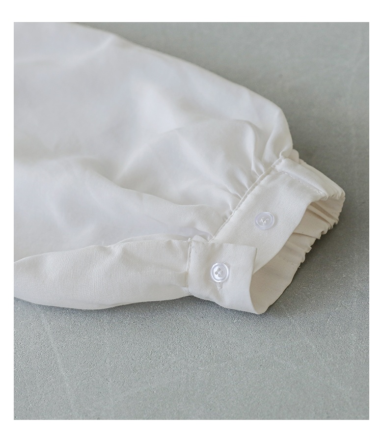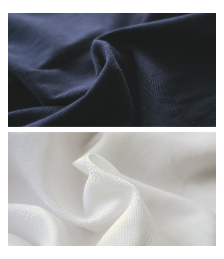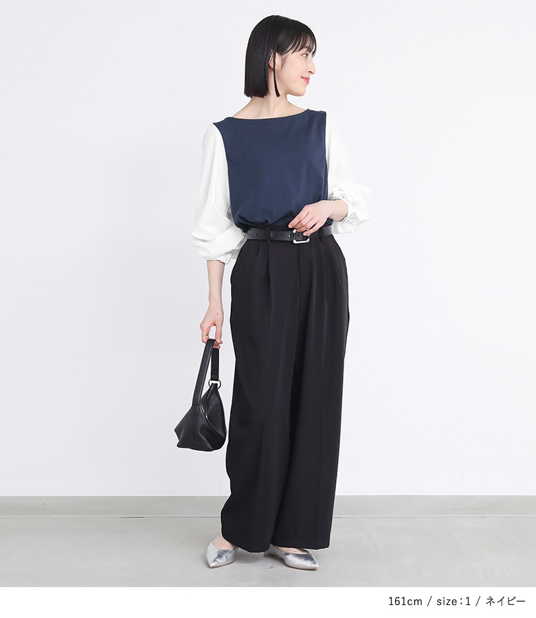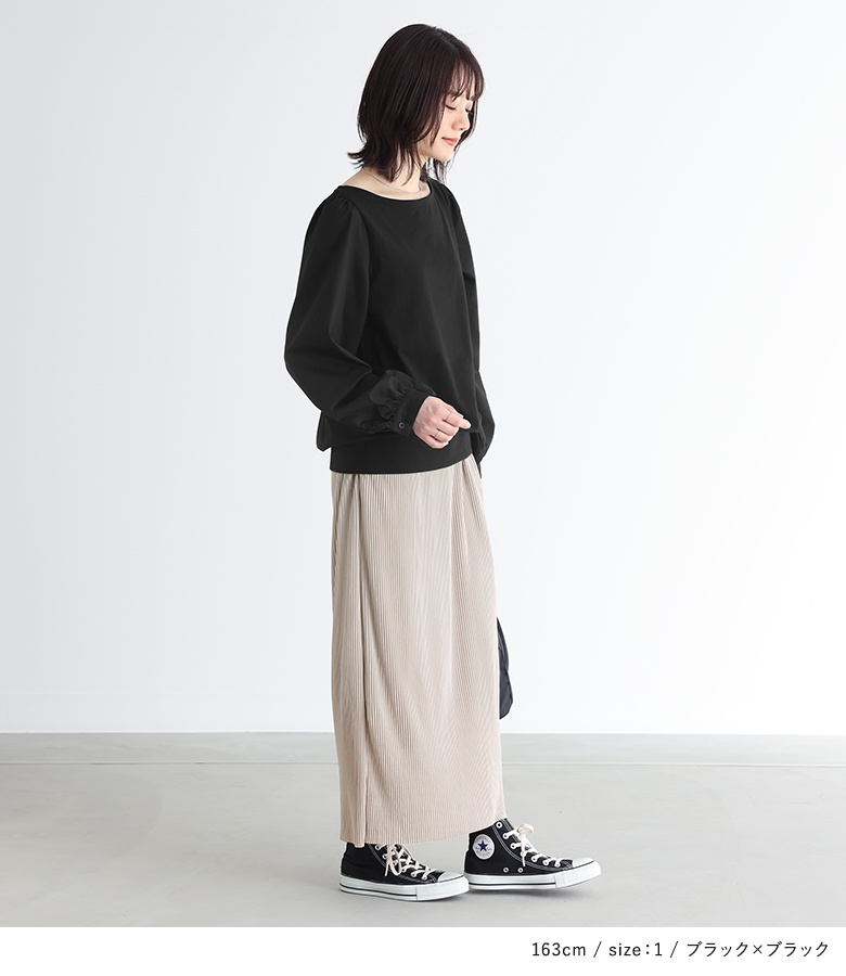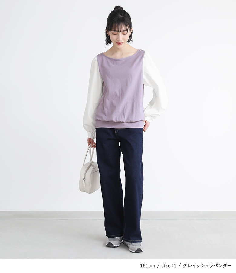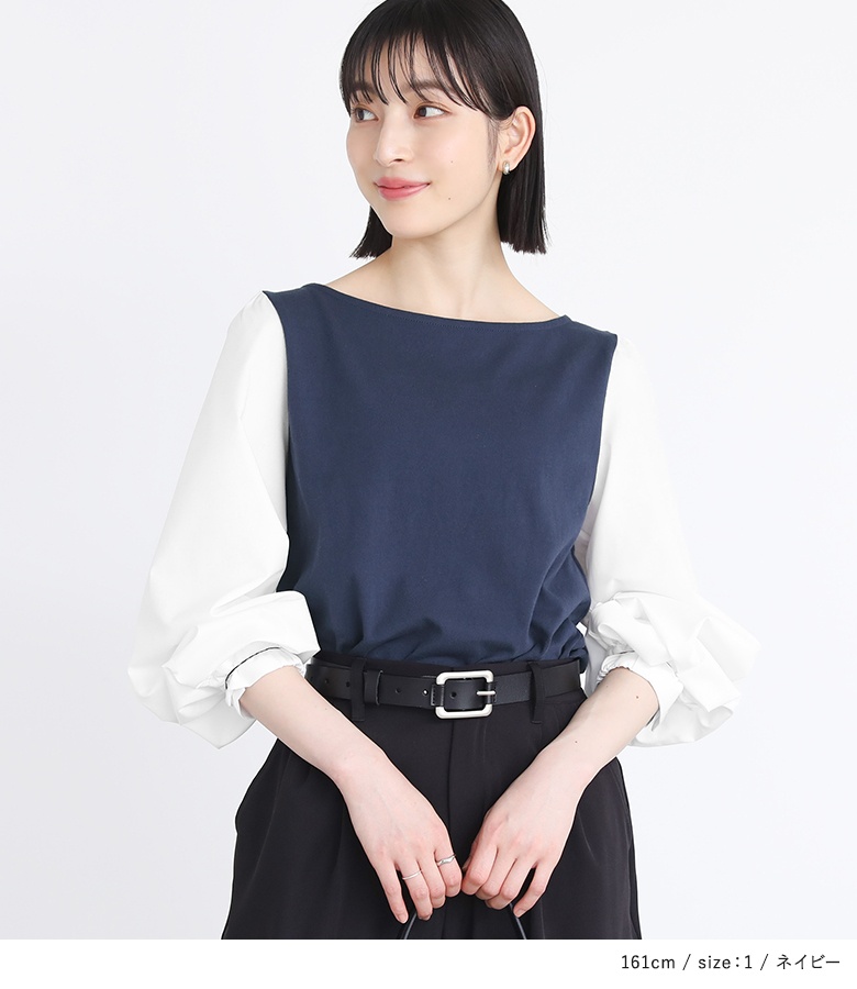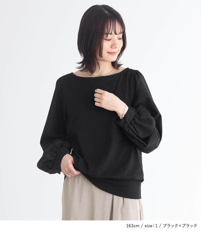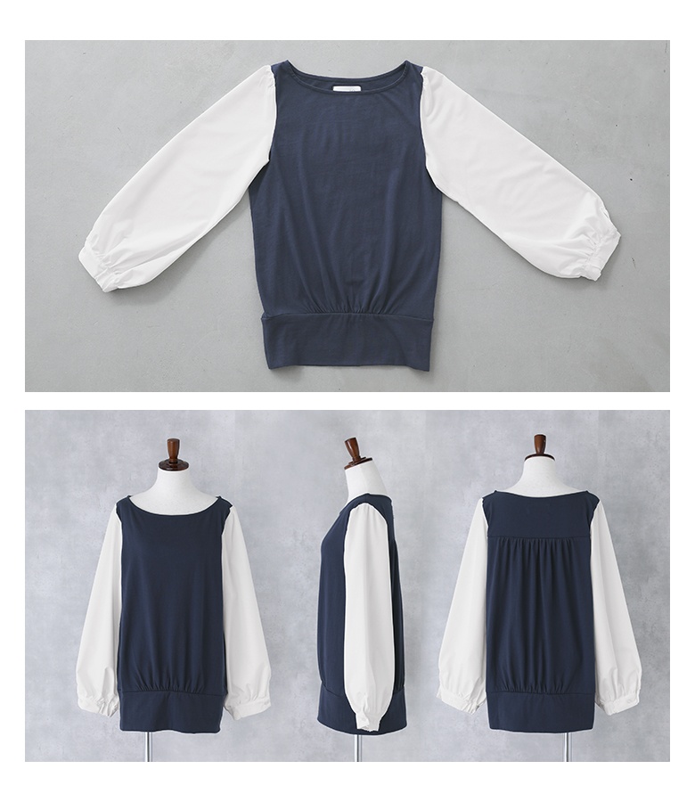 身頃は心地良い肌触りのカットソー生地を使用。袖部分は柔らかな布帛生地で上品見えする素材です。