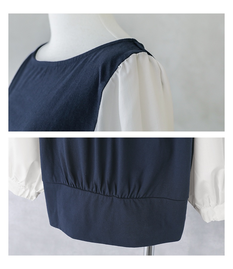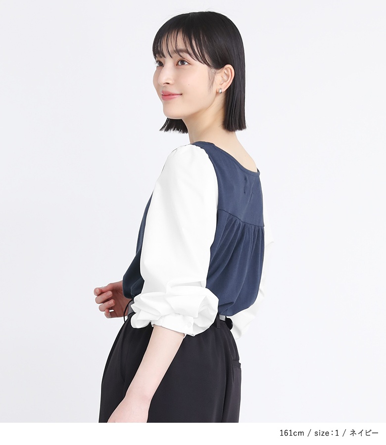 異素材使いとぽわん袖がポイントの配色デザインカットソー。袖口はゴムシャーリングになっており、そのまま長袖で、まくって7分丈・5分丈で、とアレンジができるデザインになっています。メリハリの効いた配色デザインが着こなしのアクセントに。背中はギャザーデザインでバックスタイルもお洒落な一枚。
