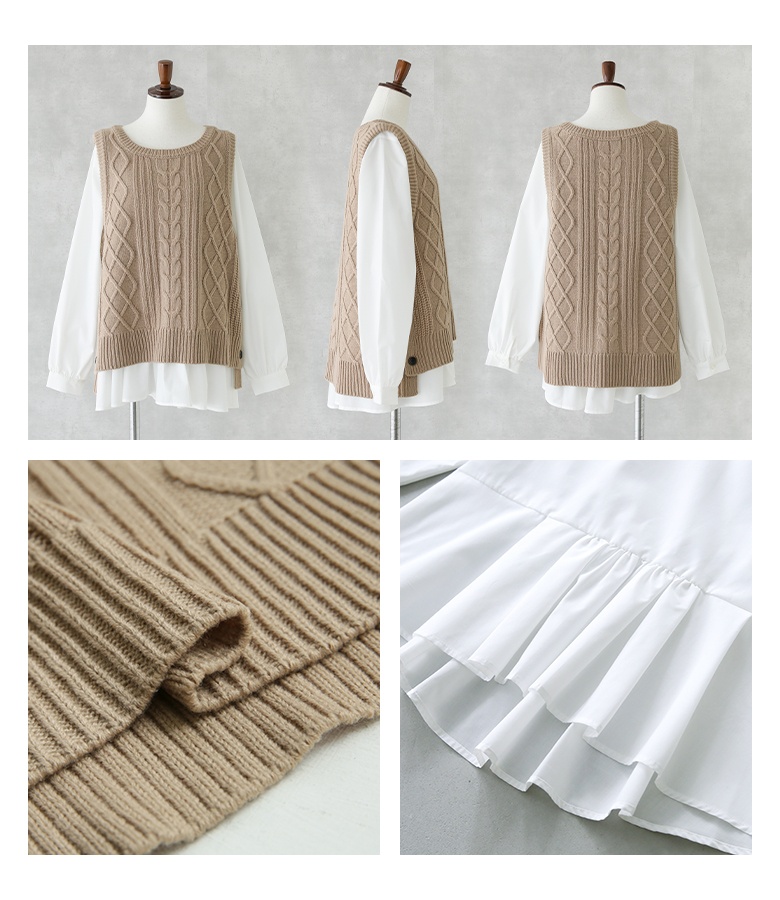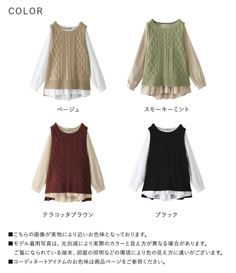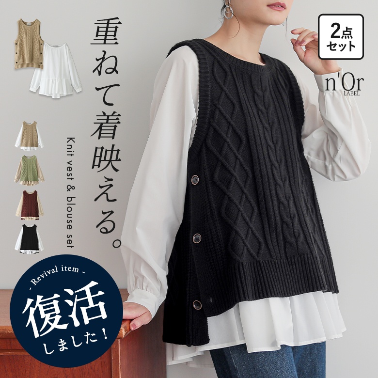 レディース 2点セット 2点SET セット トップス ブラウス シャツ プルオーバー ニット ケーブルニット ニットベスト ベスト クルーネック ノーカラー パフスリーブ ノースリーブ 長袖 ギャザー タック フリル スリット スラッシュ ペプラム 切り替え 配色 無地 レイヤード 重ね着 おうちで洗える 2way 秋冬 女子会 カジュアル お出掛け 大人女子 大人可愛い 上品 きれいめ シンプル ニュアンス ラフ Mサイズ Lサイズ LLサイズ 3Lサイズ ぽっちゃり 体型カバー 大きいサイズ n'OrLABEL ノアールレーベル ホワイト 白 ベージュ ブラック 黒 スモーキーミント テラコッタブラウン 緑 茶色[ID]ten0176