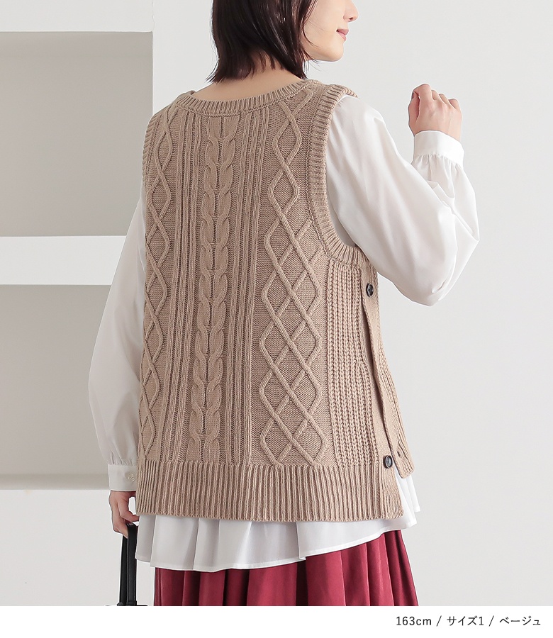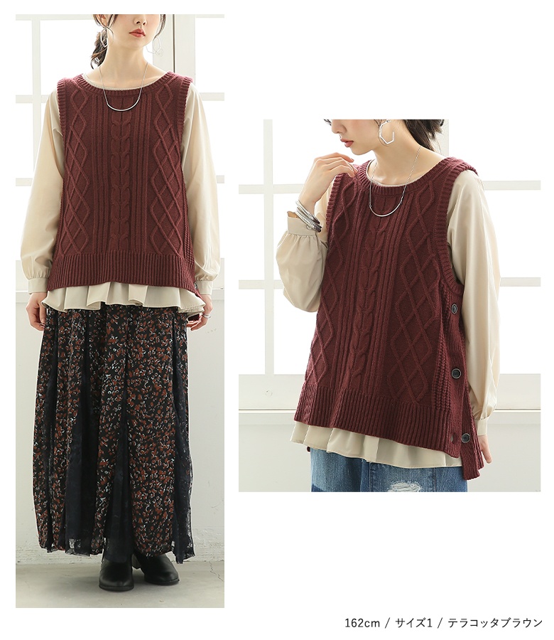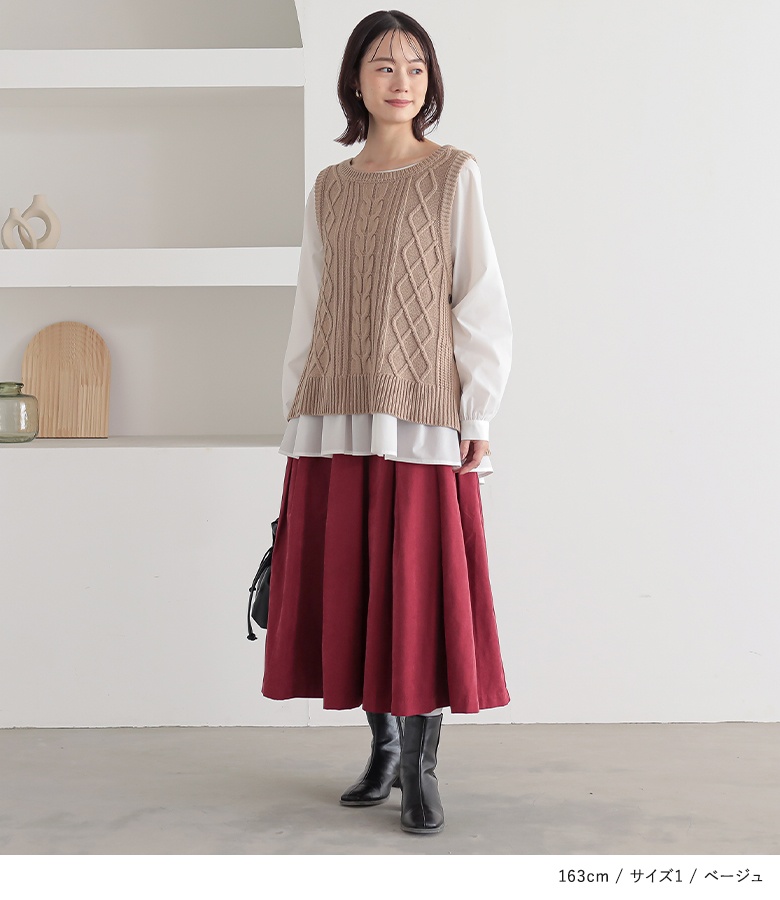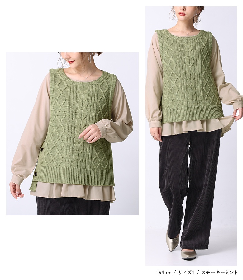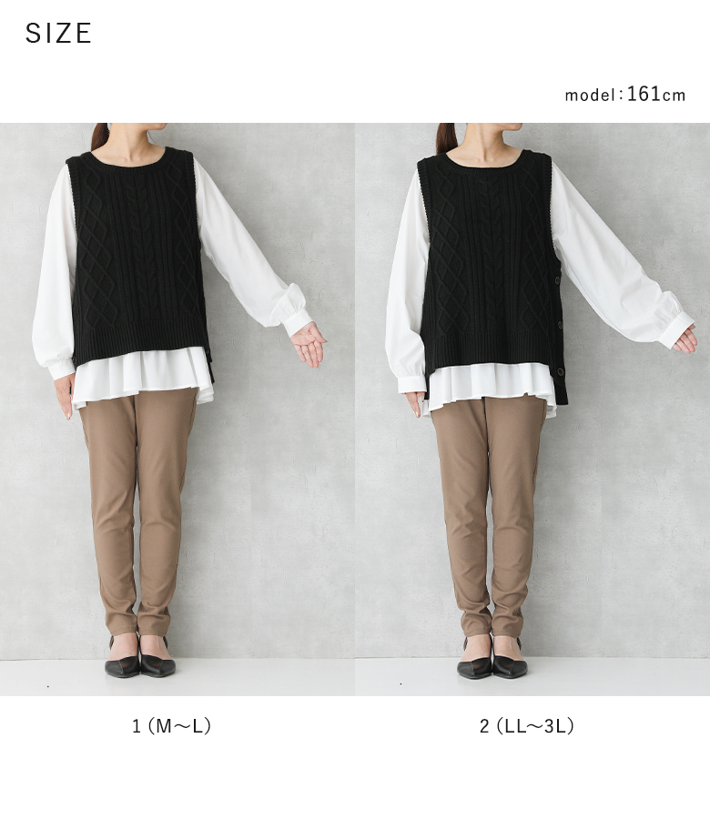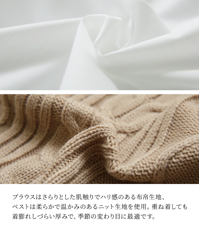 さらっとしたハリのある布帛生地のブラウスに、柔らかで温かみのあるミドルゲージのニットベスト。M〜3Lサイズ展開で自分のお好みのサイズが選べるのも嬉しいポイントです♪