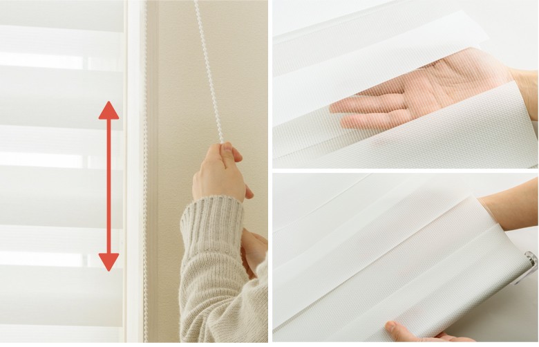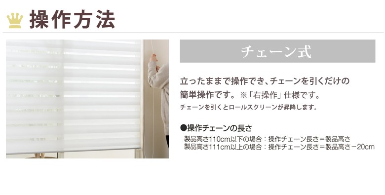 チェーンを引くだけで開け閉めラクラク♪生地の薄地部分は光を十分に取り入れる厚さ、厚地部分は透けにくい厚さです。