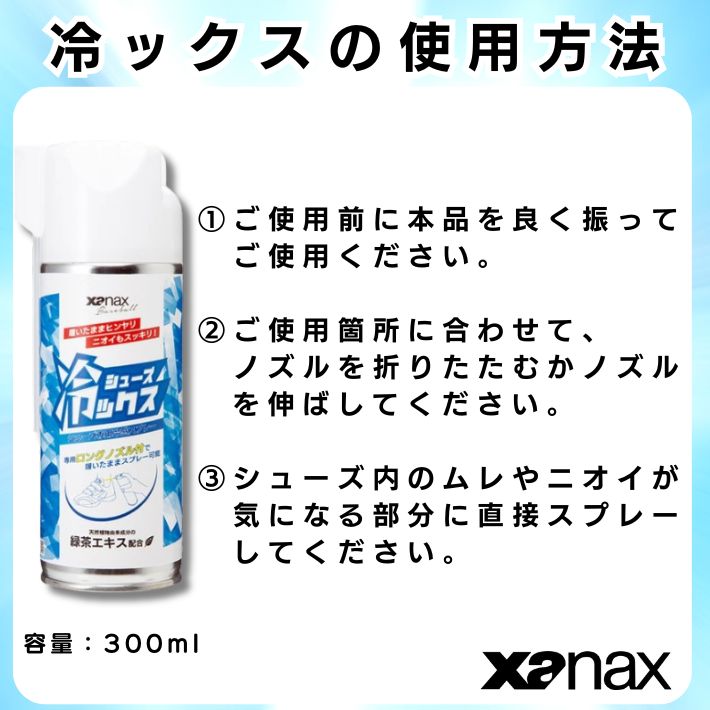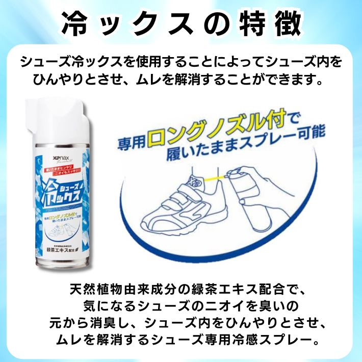ザナックス,シューズ冷ックス,冷感スプレー,シューズ専用,ムレ対策,消臭スプレー,緑茶エキス配合,履いたまま使える,瞬間冷却,爽快クール,足汗対策,ニオイ対策,熱中症対策,野球,サッカー,ゴルフ,スパイク,トレーニングシューズ,ビジネスシューズ,運動靴,アウトドア,スポーツ用品,シューズリフレッシュ,足元快適,足のニオイ,ムレ解消,クールダウン,長時間使用OK,持ち運び便利,簡単ケア,熱ダメージ軽減,水ぶくれ対策,猛暑対策,夏用アイテム,スポーツ向け,仕事用,部活必須,練習用,試合用,足元スッキリ,速乾性,ノズル調整可能,消臭&冷却,運動後に最適,高評価アイテム,ギフト,プレゼント,コンペ景品,チーム用,スポーツケア