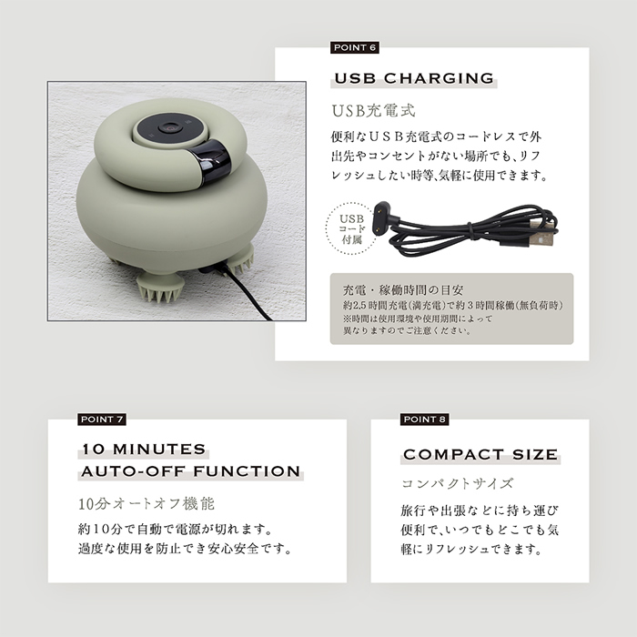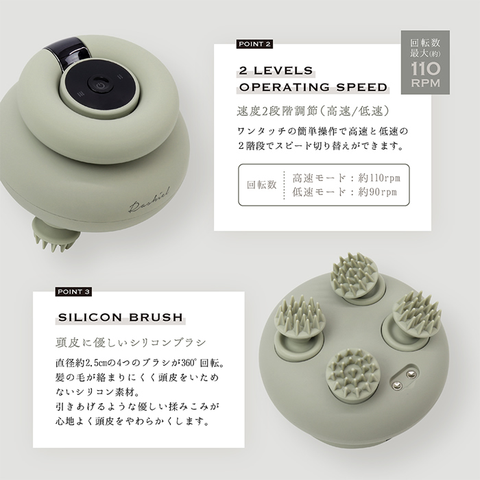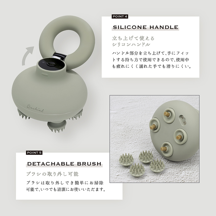 ◎4つのブラシが360°回転して頭皮の皮脂や汚れを洗浄し、頭皮をやわらかくするヘッドスパブラシ。