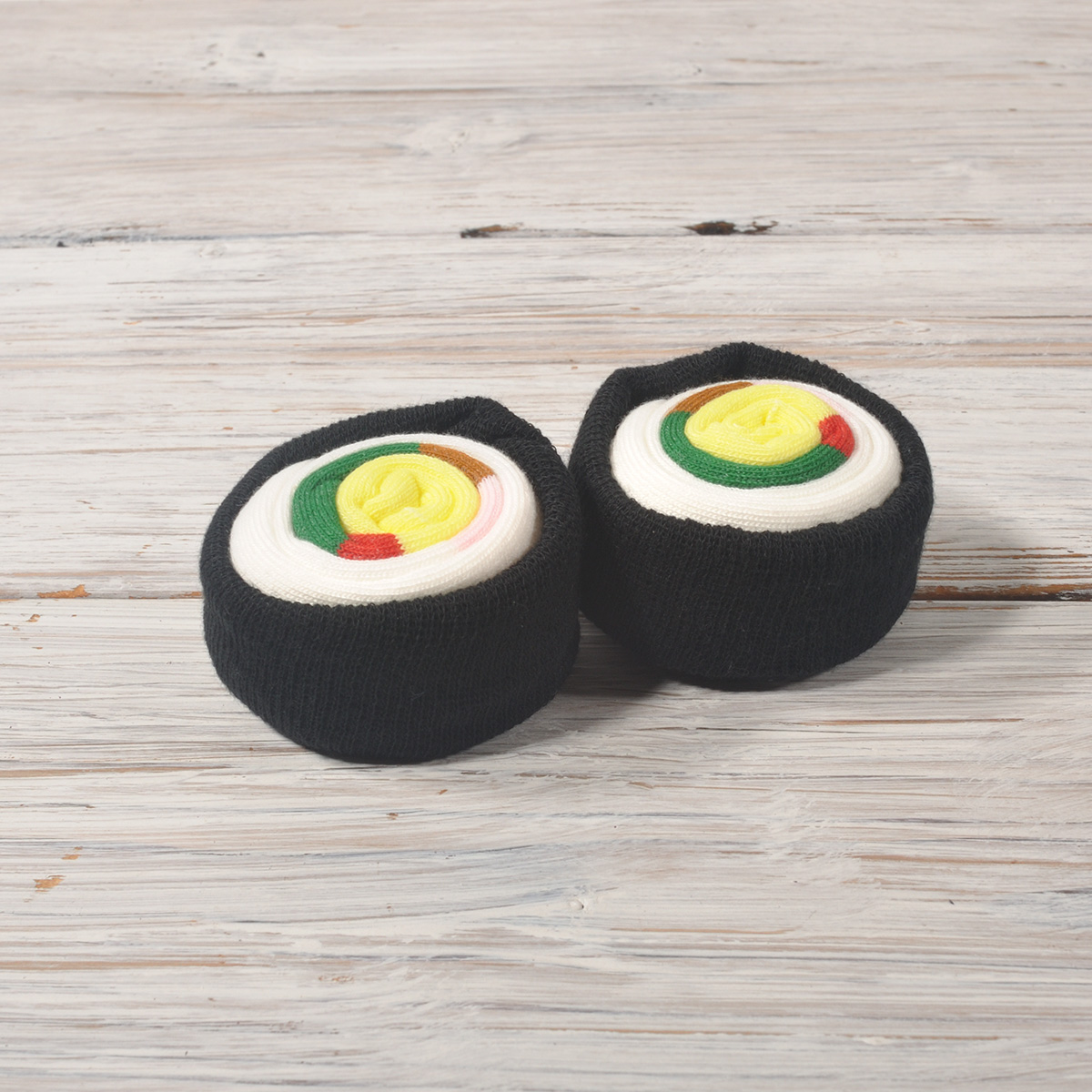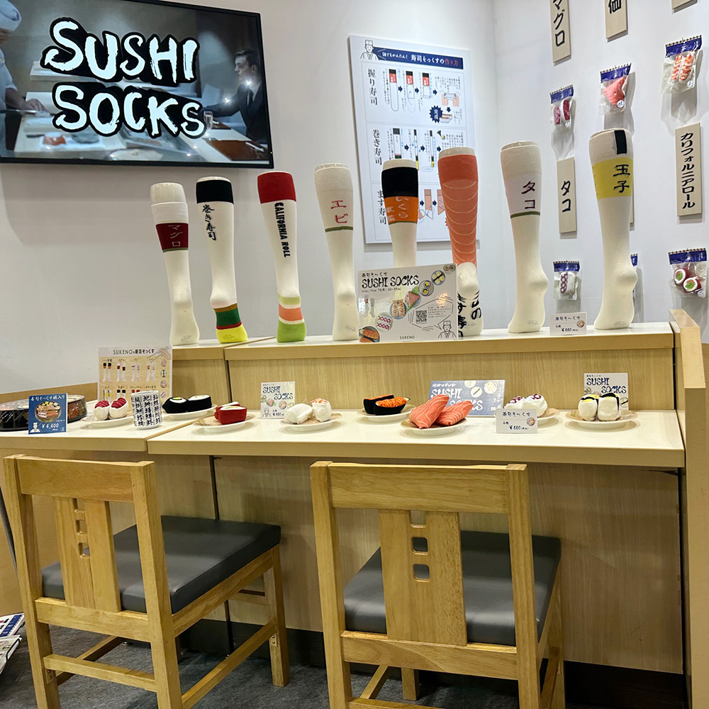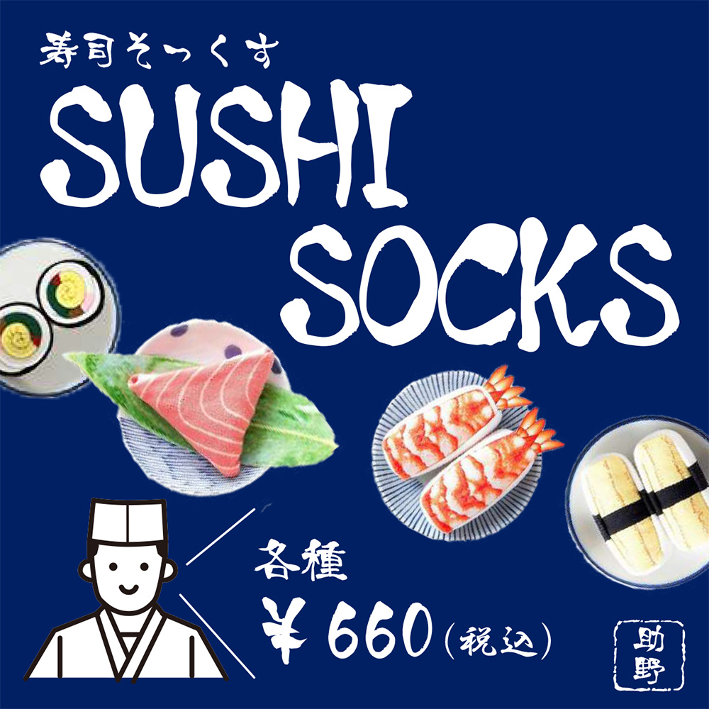 最近見ていなかった国内の展示会、商品を物色すべく展示会を歩いているとき、私の目に飛び込んできた光景に思わず驚きを隠せなかった。それは展示ブース自体がまるで小さなお寿司屋さんの店内。が、何か違和感を感じ、よく見てみるとお皿に載っている握り寿司や巻き寿司が全て靴下だとか!?!もうこの瞬間、この商品を仕入れる、という事以外私の脳裏には浮かばなかった。これがSUKENO(助野株式会社)との出会いです。