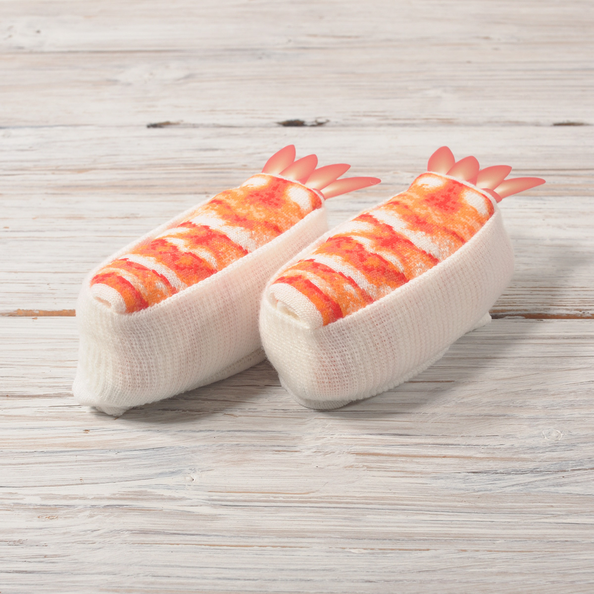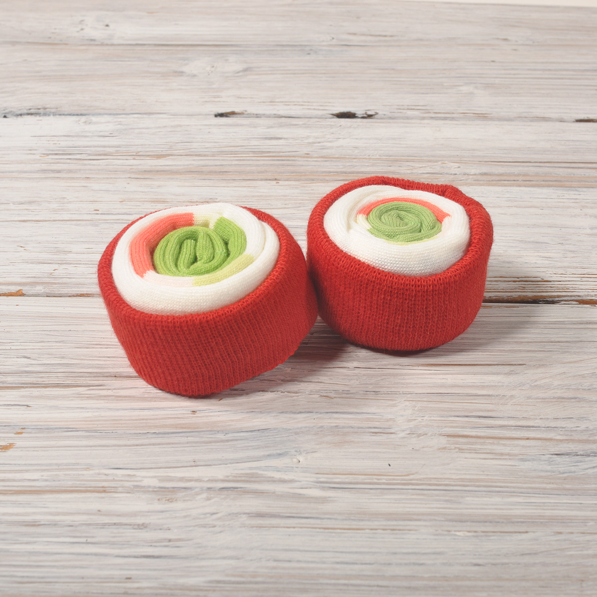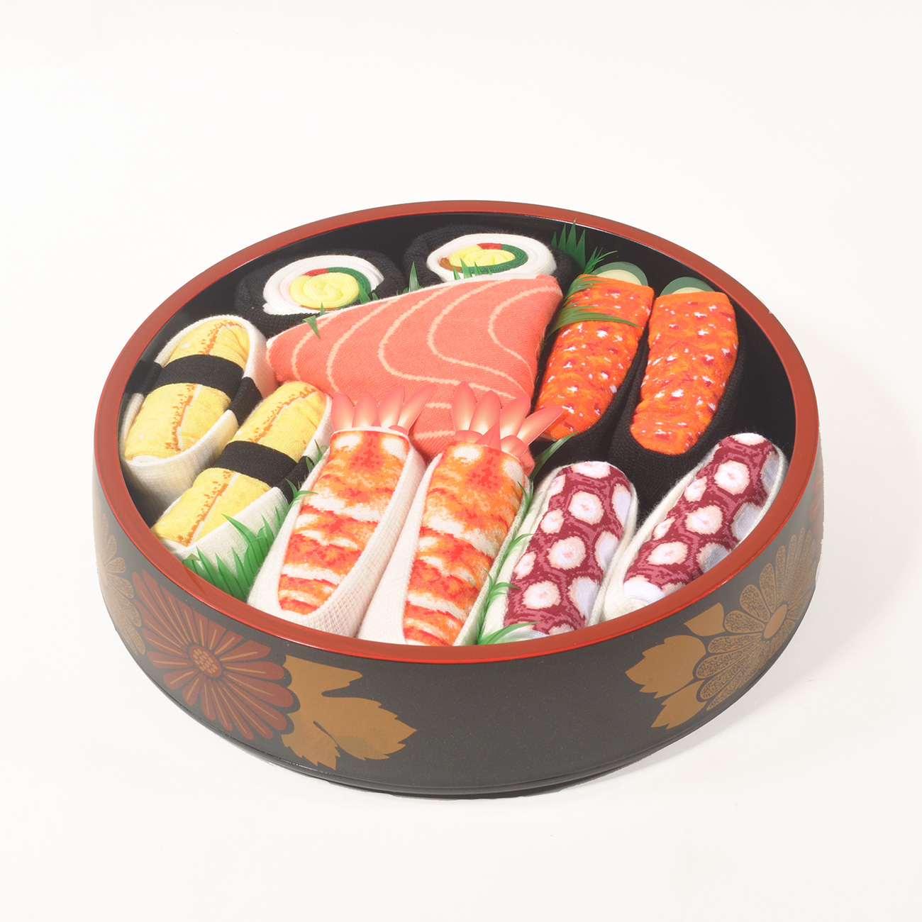 最近見ていなかった国内の展示会、商品を物色すべく展示会を歩いているとき、私の目に飛び込んできた光景に思わず驚きを隠せなかった。それは展示ブース自体がまるで小さなお寿司屋さんの店内。が、何か違和感を感じ、よく見てみるとお皿に載っている握り寿司や巻き寿司が全て靴下だとか!?!もうこの瞬間、この商品を仕入れる、という事以外私の脳裏には浮かばなかった。これがSUKENO(助野株式会社)との出会いです。