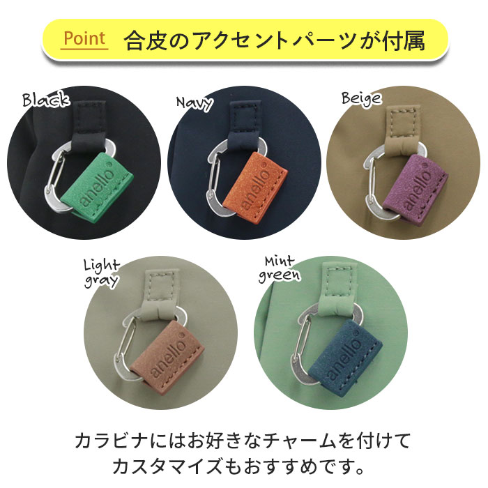 カラビナや合皮のアクセントパーツなど細部のこだわりがポイント。