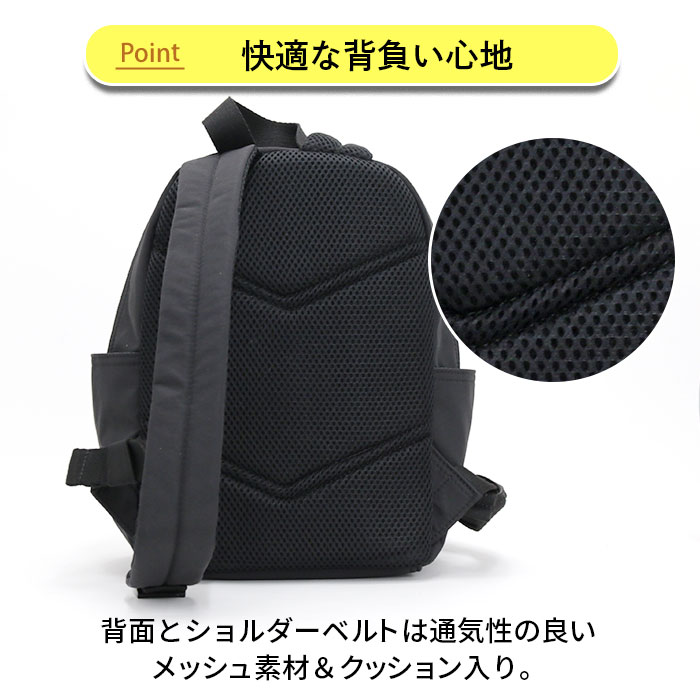 蒸れやすい背面はエアメッシュ素材で快適に。