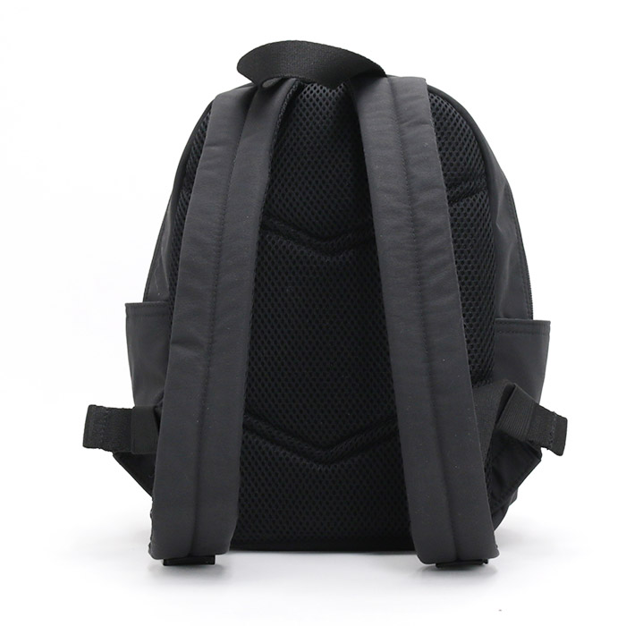 蒸れやすい背面はエアメッシュ素材で快適に。前面のカラビナにはお好きなチャームを付けてカスタマイズもおすすめです。
