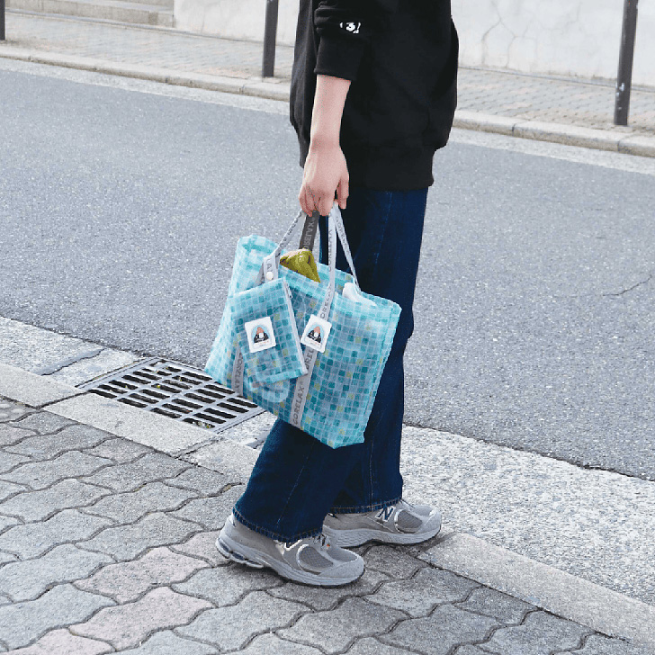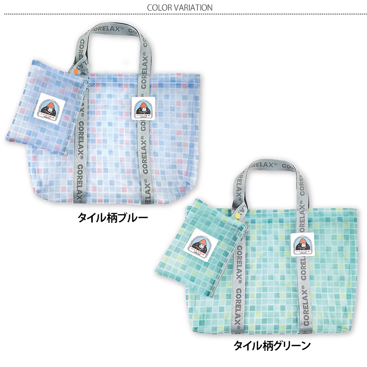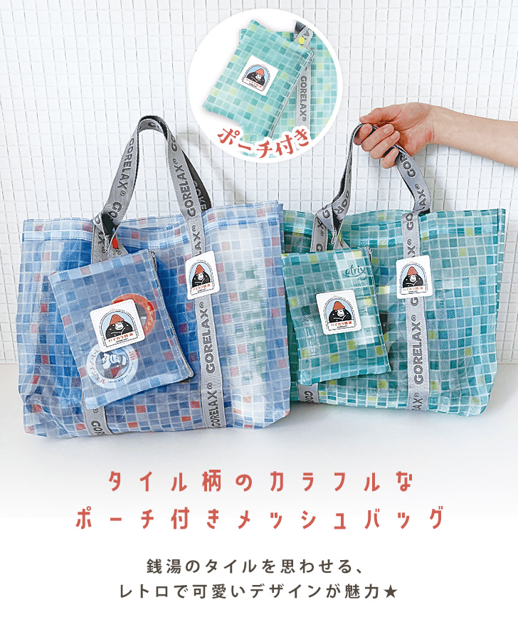 タイル柄のカラフルなポーチ付きメッシュバッグ