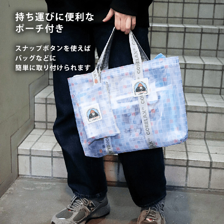 持ち運びに便利なポーチ付きで、スナップボタンを使えばバッグなどに簡単に取り付け可能