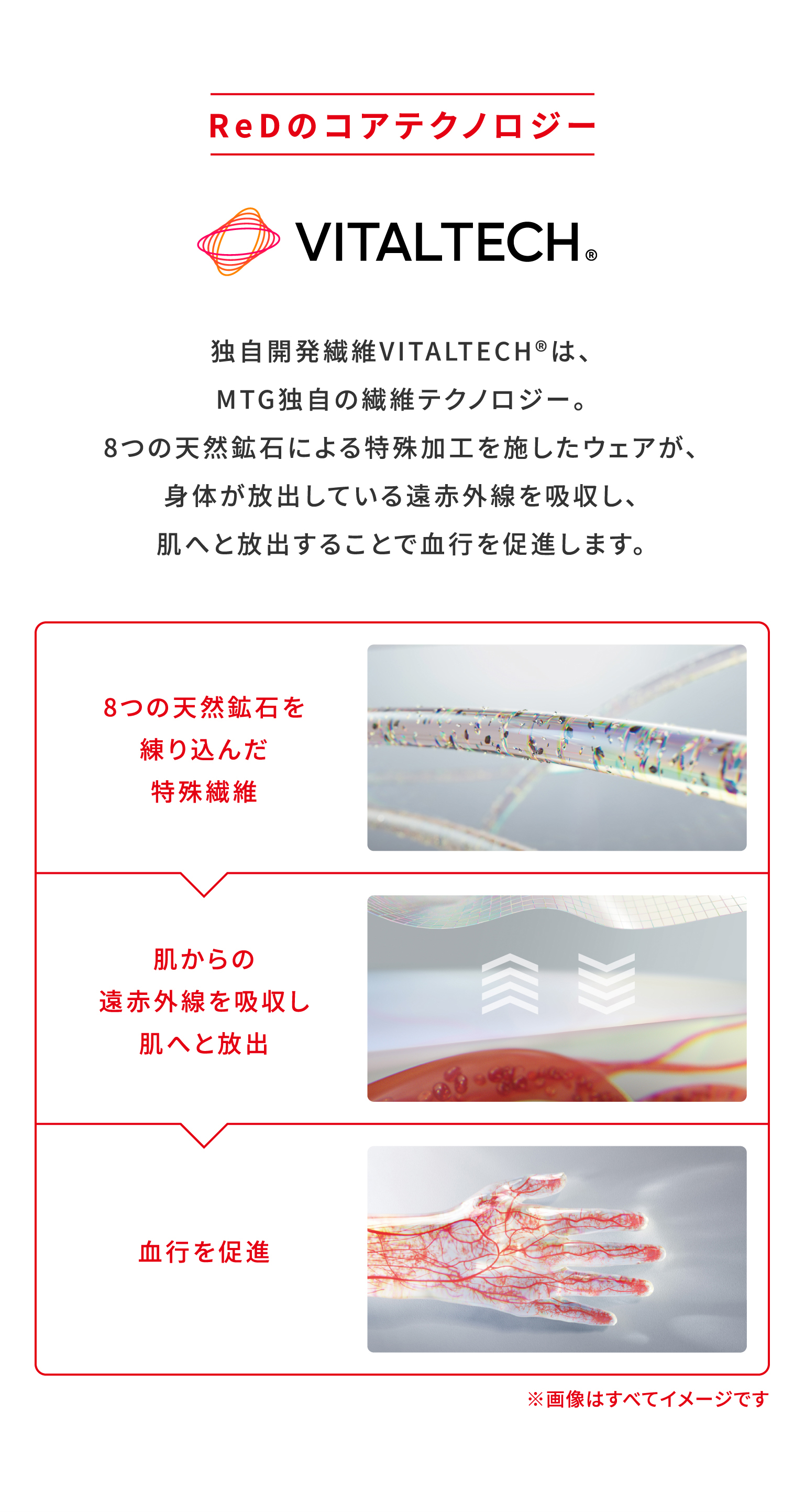 8つの天然鉱石を独自配合した「独自開発繊維VITALTECH®」が身体が放出する遠赤外線を吸収し、再び肌へ放出することで血行を促進。