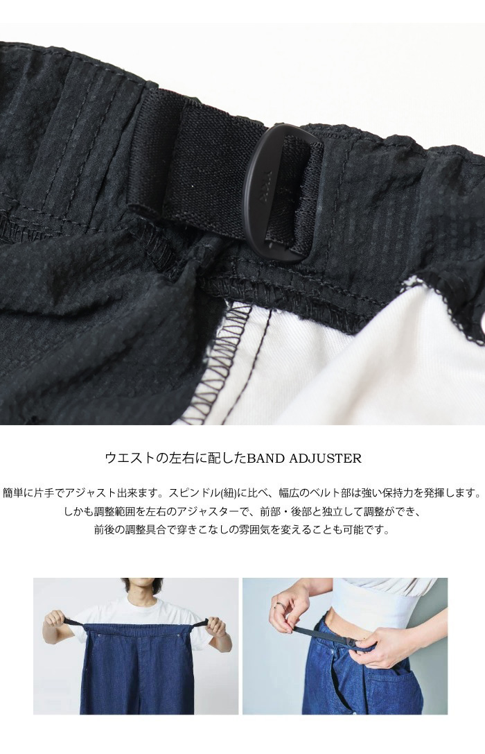 サイズが一つしかないのでサイズ選びが不要となっており、サイズレンジはXSからXXLまでカバーします。これ1本でワンマイルウエアとして、家族でも、体格の異なる友達ともシェアが可能です。その秘密はウエストの左右に配したBAND ADJUSTERにあります。簡単に片手でアジャストできます。スピンドル(紐)に比べ、幅広のベルト部は強い保持力を発揮します。