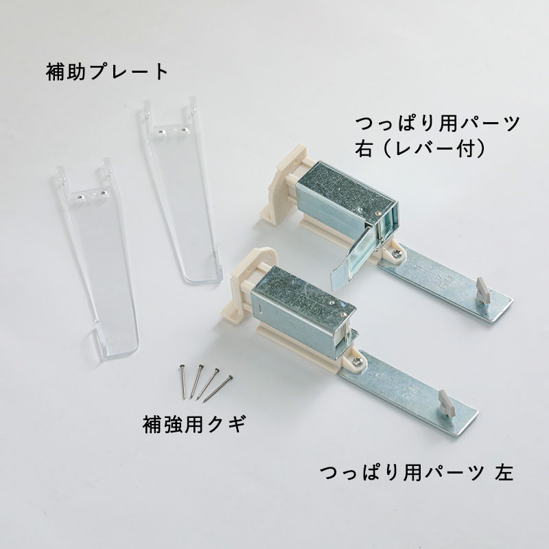 つっぱり用パーツ右(レバー付)1個、つっぱり用パーツ左1個、補強用クギ4本、補助プレート右、左各1個