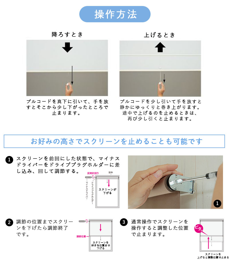 ※スクリーンに風が強くあたる時は、スクリーンを巻き上げておいてください。スクリーンがあおられて、置物などにあたり破損する恐れがありますので十分お気を付けください。