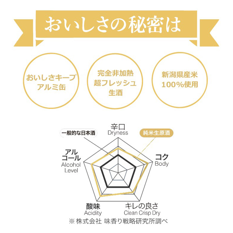 厳選した新潟県産米を100%使用し、しぼった後に火入れも割り水もせず、出来たてのおいしさをそのままアルミ缶に閉じ込めた純米生原酒です。