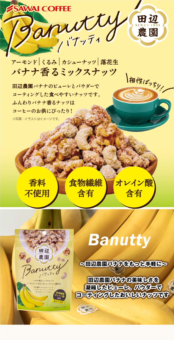 「Banutty(バナッティ)」は、エクアドルの田辺農園で育った高糖度バナナのピューレとパウダーを使用した、香料不使用のミックスナッツです。規格外バナナをアップサイクルして活用し、人にも地球にもやさしい商品としてつくられています。職人が手作業で丁寧にコーティングしたナッツは、バナナの自然な甘みと香ばしさが調和し、コーヒーのビター感と見事にマッチ。香り豊かでまろやかな味わいが楽しめる、新しいコーヒータイムのお供です。