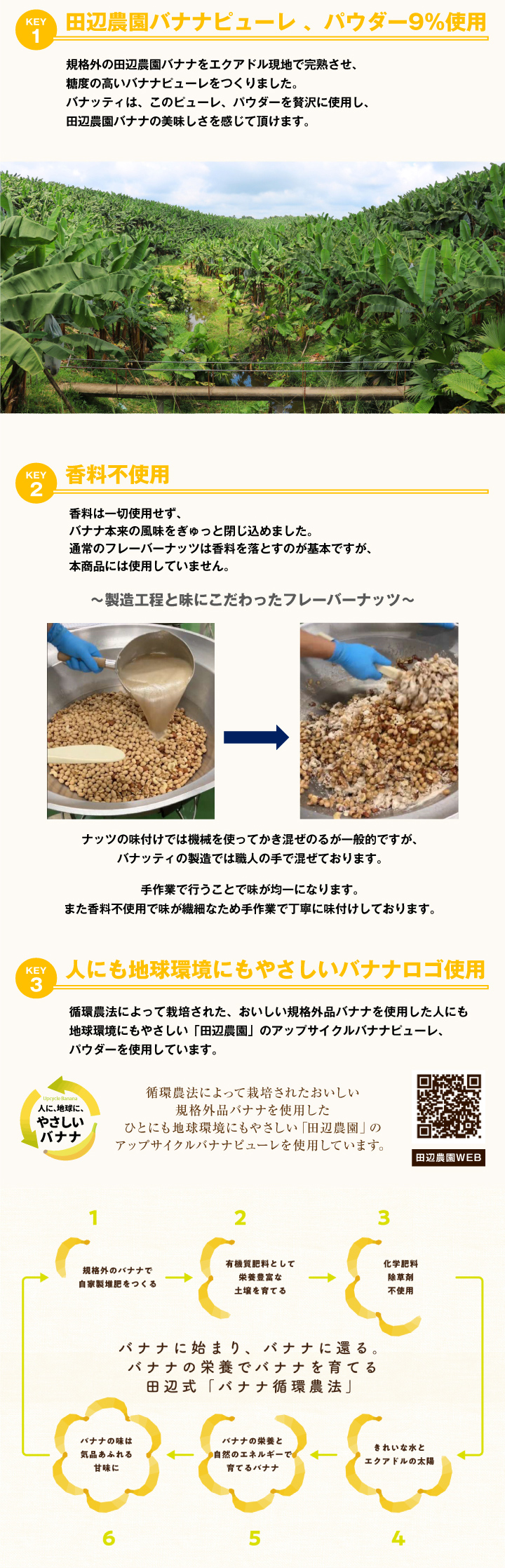 「Banutty」に使われているバナナは、規格外で市場に出回らないものをアップサイクルして活用。田辺農園独自の“バナナ循環農法”で育てられた、環境にも人にもやさしいバナナです。堆肥づくりから始まり、化学肥料・除草剤不使用で育てられた自然の恵みが詰まった一粒。美味しさだけでなく、持続可能な農業への想いが込められた、エシカルなスナックです。