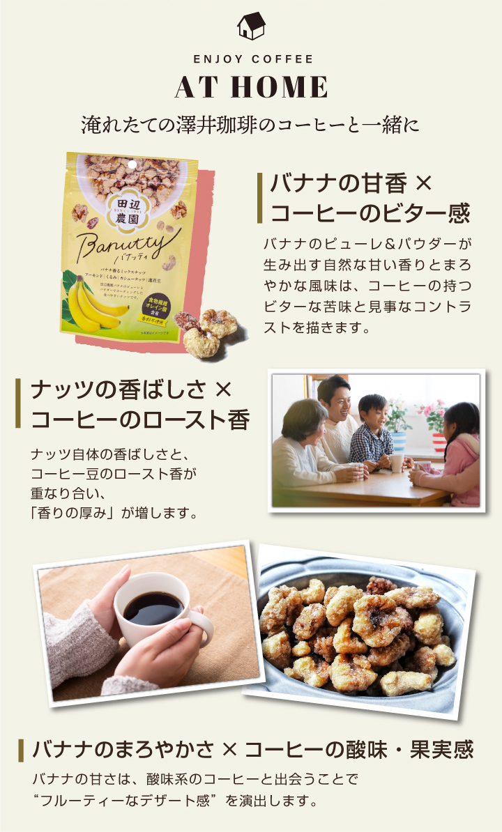 香ばしいナッツとまろやかなバナナの甘みが、コーヒーのビターな風味や酸味・果実感と絶妙に調和。淹れたての澤井珈琲と一緒に味わえば、まるでデザートのような贅沢な時間を演出します。ナッツのロースト香とコーヒーの焙煎香が重なり、豊かな香りが口いっぱいに広がる極上のペアリングを楽しめます。日常のコーヒータイムを少し特別にしてくれる一品です。