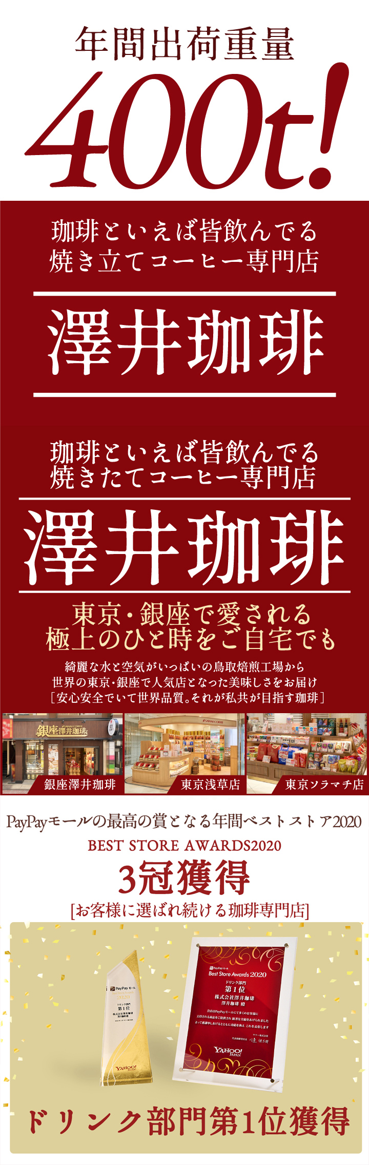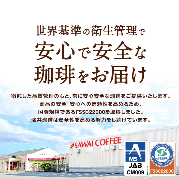 澤井珈琲(さわいこーひー)では、お客様のお家に商品が届き、箱を開けた瞬間。そして、トレードマークの赤いコーヒー袋の封を開けた時に鮮度抜群の「香り高さ」と、飲んだときの「味わい」に感動して頂けるように、レギュラーコーヒーはご注文を頂いてから焙煎をして焼きたてのコーヒー、コーヒー豆、珈琲、珈琲豆をお届けをしている焼き立て珈琲専門店です。お客様に「美味しい」と言って喜んで頂く事が私たちの喜びと思ってます。「美味しいコーヒーをお届けしたい」と想い続けて生まれたこだわりの味を、どうぞ、この機会にお楽しみくださいませ。澤井珈琲では、コーヒー豆は挽き方がご選択いただけます。珈琲豆を挽く事をお楽しみ頂ける『豆のまま』や、私共の専用の特注サイズの大型のミルで挽いて、コーヒー粉の状態にしてお届けする方法がございます。中挽き、細挽き、粗挽き、荒挽きなど様々な挽き方がございますが、私共がお薦めする『店長のおすすめ挽き』にて、そのコーヒーに合った一番美味しいと思える挽き方に挽いてお届けします。東京の銀座にも実店舗を構え、都内では浅草やスカイツリーのあるソラマチにも出店。「鳥取のコーヒー屋さん」とも呼ばれてますが、空気が綺麗で自然豊かな鳥取県に焙煎工場を構え、隣接する島根県の松江市や出雲市にも実店舗がございます。顔の見えないネット通販ですが、全国11店舗を展開する安心安全な澤井珈琲は、特徴的な「赤いコーヒー袋」に入れて、全国の珈琲好きにお選び頂いてます。よく間違えられる名前として、沢井珈琲、沢井コーヒー、澤井珈琲店、澤井珈琲本店、さわいこーひー、サワイコーヒーなどがございますが、正式名称は澤井珈琲となります。