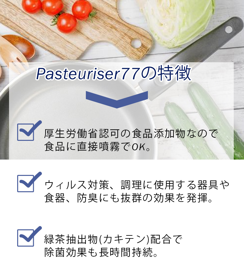 DOVER Pasteuriser77(ドーバー パストリーゼ77)はアルコール分77%、カテキン配合された除菌・洗浄スプレーです。