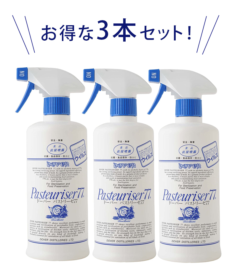 アルコール除菌スプレー ドーバー パストリーゼ77 500ml×3個セット アルコール濃度70%以上 キッチン用 まな板 抗菌 防臭 ウイルス対策