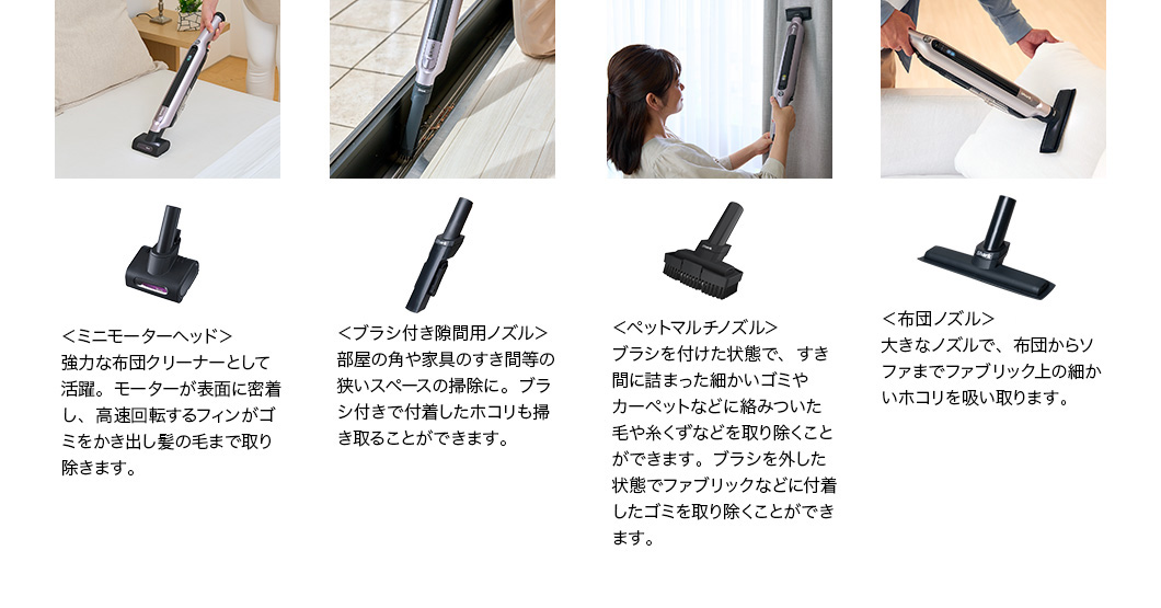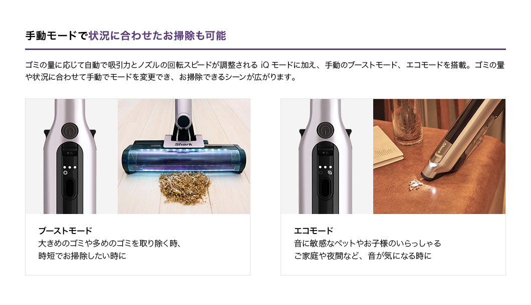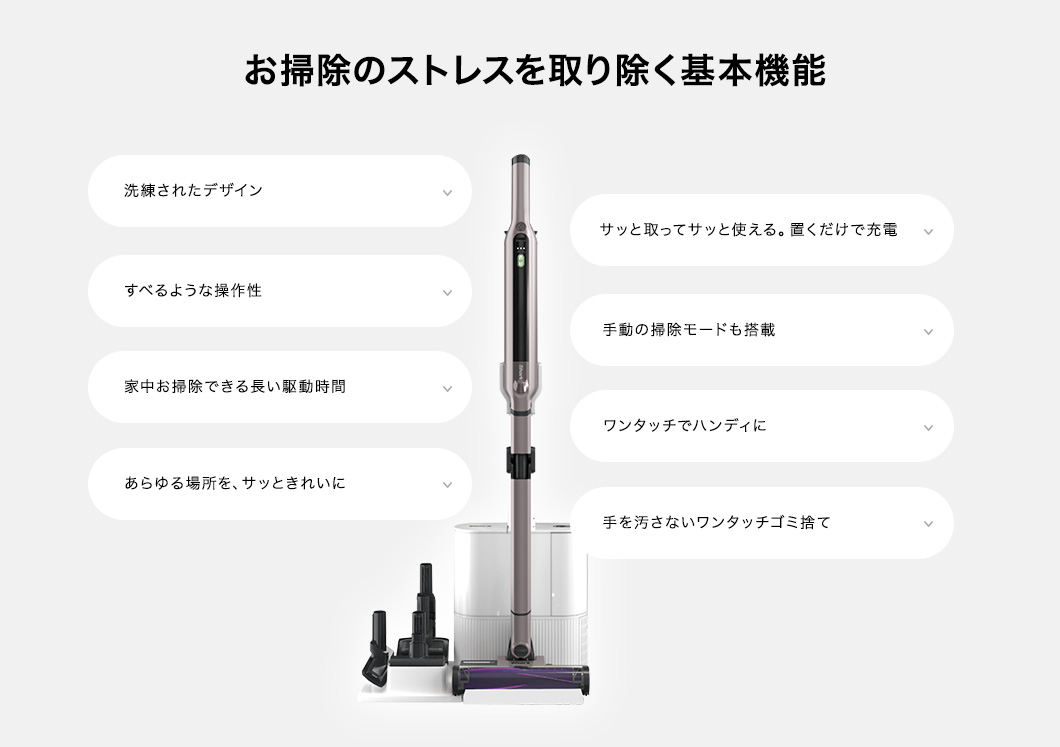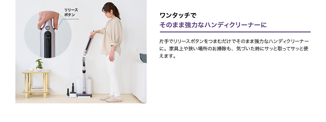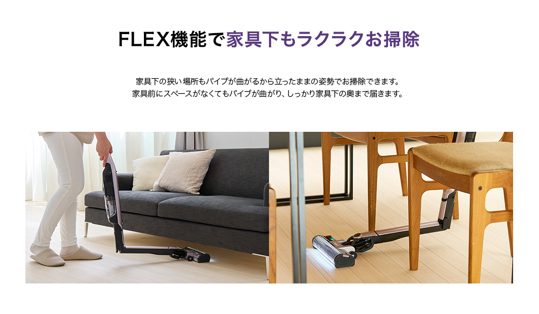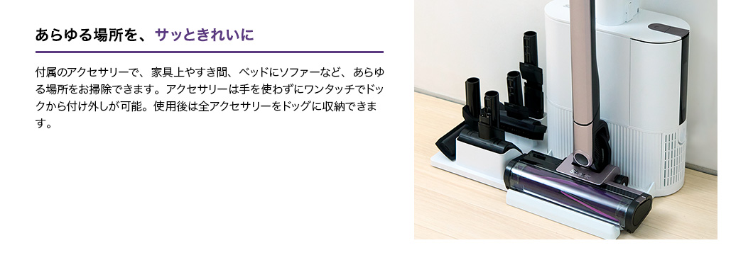 パワフル吸引に賢さと利便性をプラス! さらに進化したシャークのコードレススティッククリーナー。 パイプが曲がって家具下のお掃除もラクラクなFLEX機能&都度のゴミ捨てから解放される自動ゴミ収集ドック付きモデル。お部屋の様々な場所や車内のお掃除に便利な毛質の違うソフトブラシとスクラビングブラシのセットが追加されたオンラインストア限定セットです。