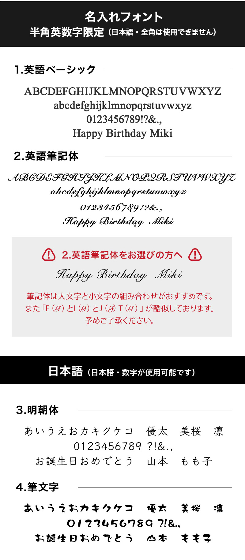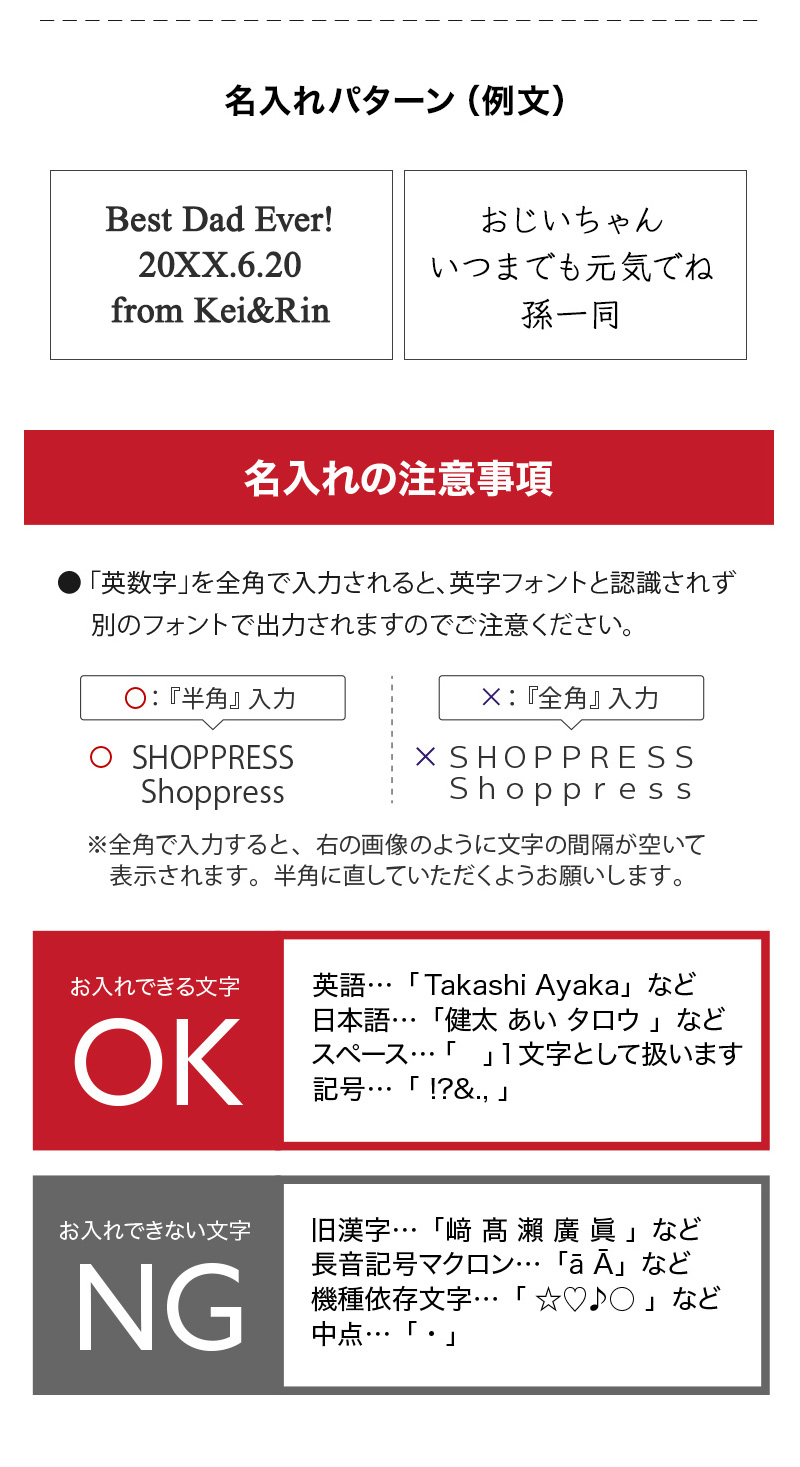 ・注文から刻印まで自動で行われるため、入力文字をそのまま印刷させていただきます。