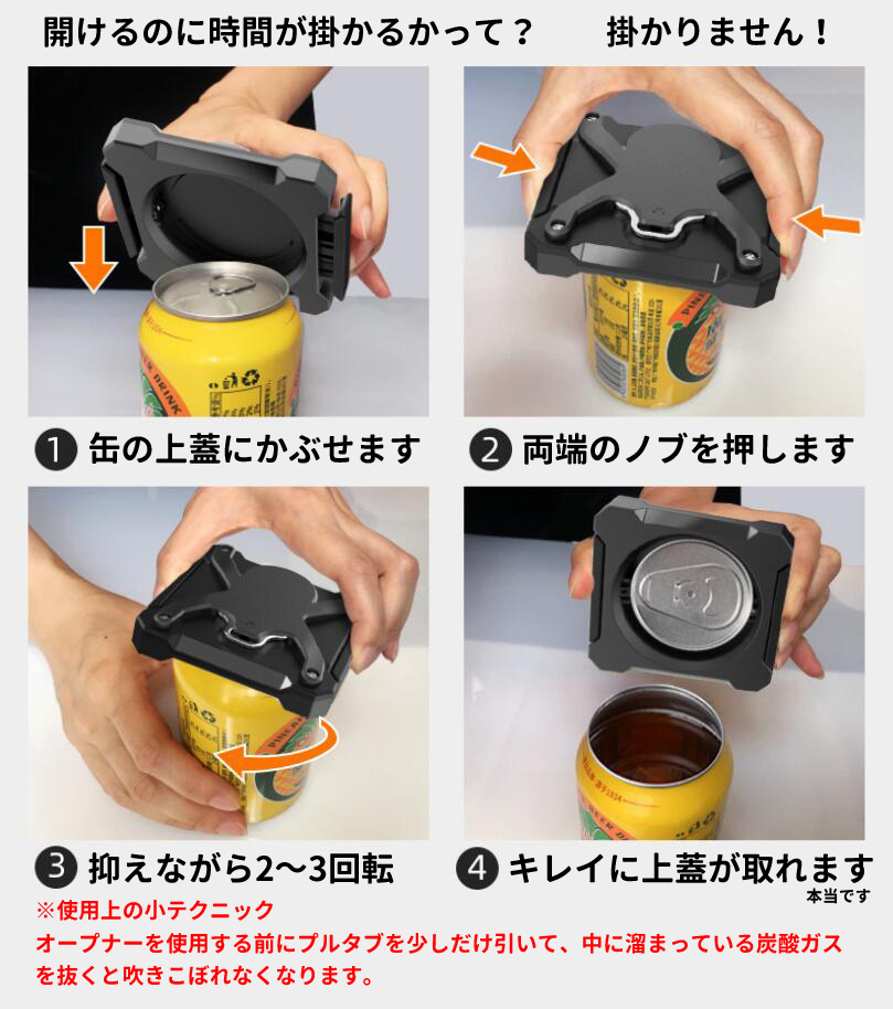 対応缶:上蓋の直径が5〜6cmまでのビール缶、ジュース缶