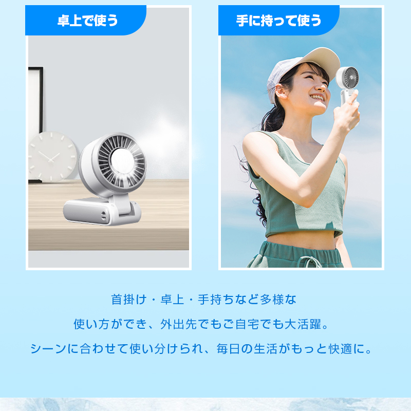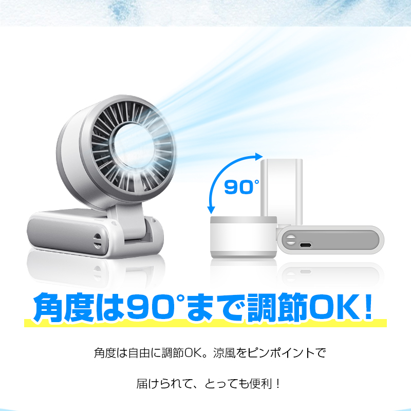 軽量でコンパクトなボディで、バッグに入れても邪魔にならず、持ち運びにとても便利です。さらに、ストラップ付き、首から掛けるだけでハンズフリーで涼しさをキープできます。両手を塞がず、アウトドアや作業中に手軽に使用でき、非常に便利です。
