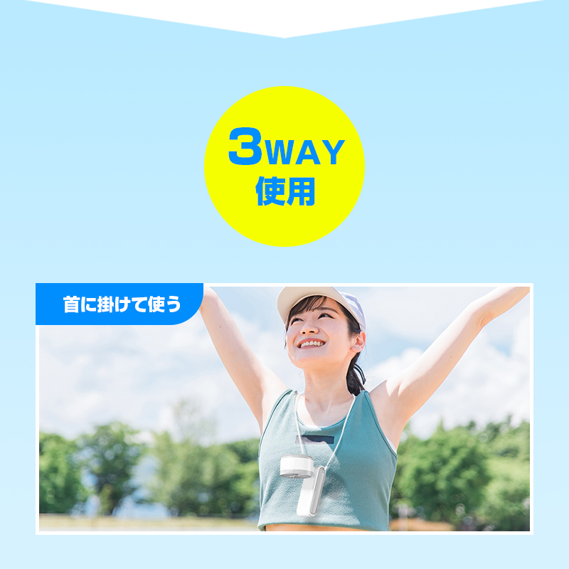 3.3WAY仕様:手持ち、卓上、ネックホルダーの3WAYで使えるため、シーンに合わせて使い分けができます。