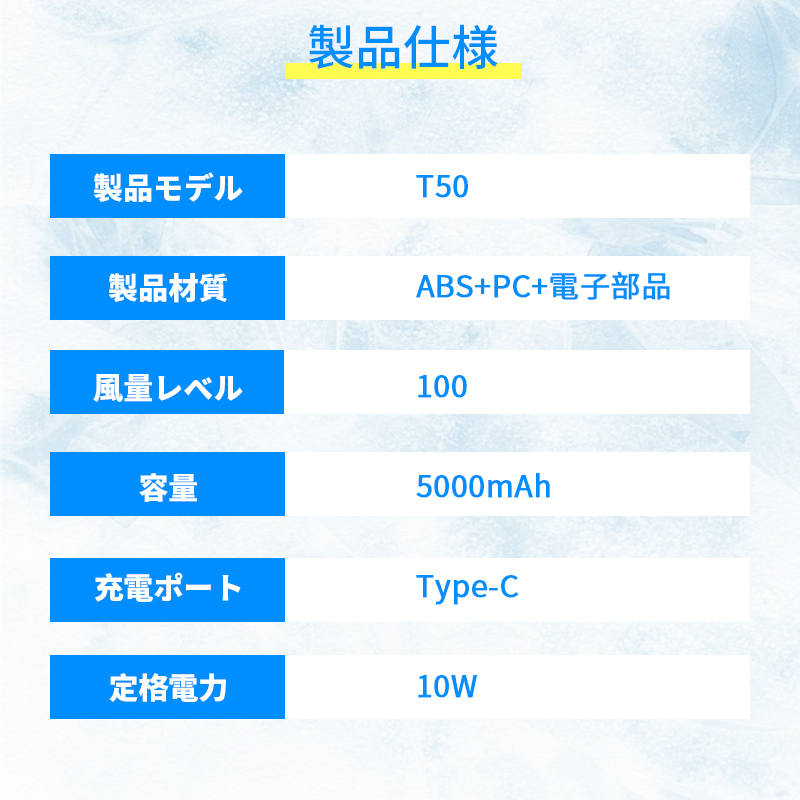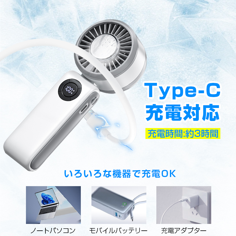 USB Type-C充電式の大容量バッテリー(5000mAh)を内蔵しており、最大10時間連続運転が可能です。炎天下での外出やイベント中でもバッテリー切れの心配はありません。省エネ設計なので、充電回数を気にせずに長時間使えるのも大きなポイントです。