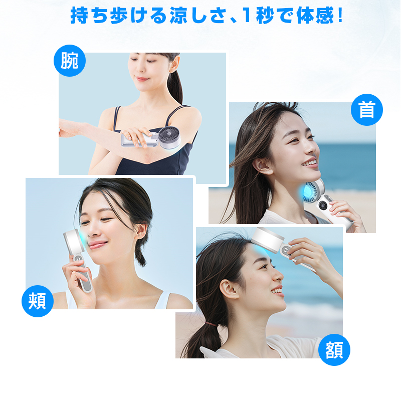 一般的なハンディファンと異なり、冷却プレートが搭載されています。電源を入れると、すぐにひんやり冷たい風が肌に直接届き、まるで冷房のような涼しさを体感できます。特に汗をかいた肌も、瞬時にクールダウンして、快適さを取り戻すことができます。