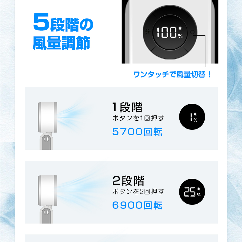 小型のファンには「風が弱い」「涼しくない」と感じることもありますが、本製品は強力なモーターを搭載しており、その不満を解消します。高回転の羽根が、勢いのある風を生み出し、屋外でもしっかりと涼しさを感じることができます。汗をかいた直後でも、素早く乾かして快適さをキープします。