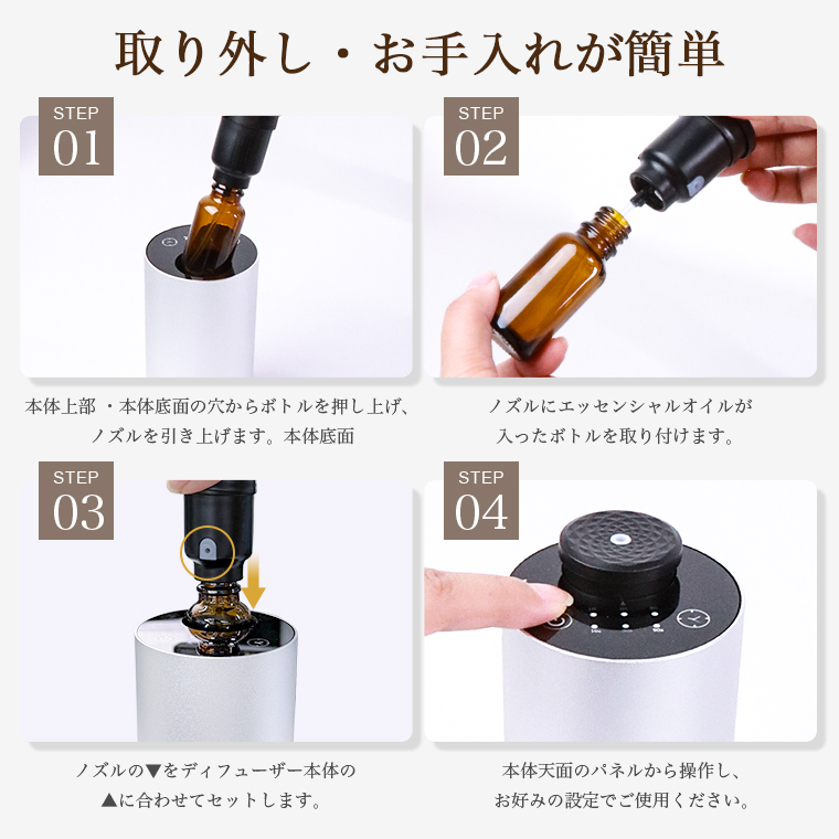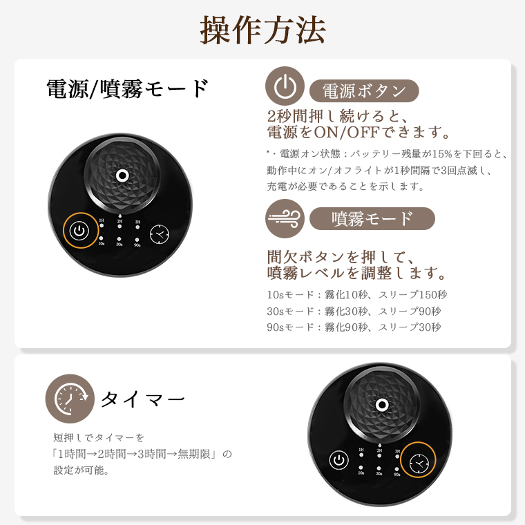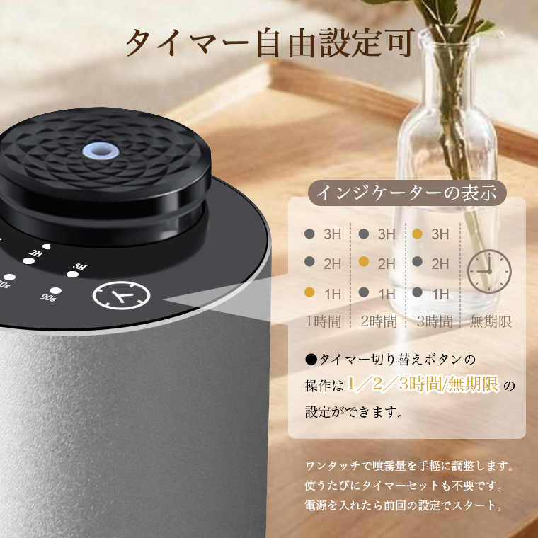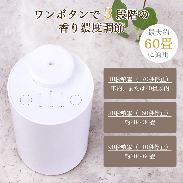3種類のタイマー(1/2/3)+ 3段階ミストモード(10秒/30秒/90秒インターバル)。空間の広さや香りの好みに合わせて自由にカスタマイズ。